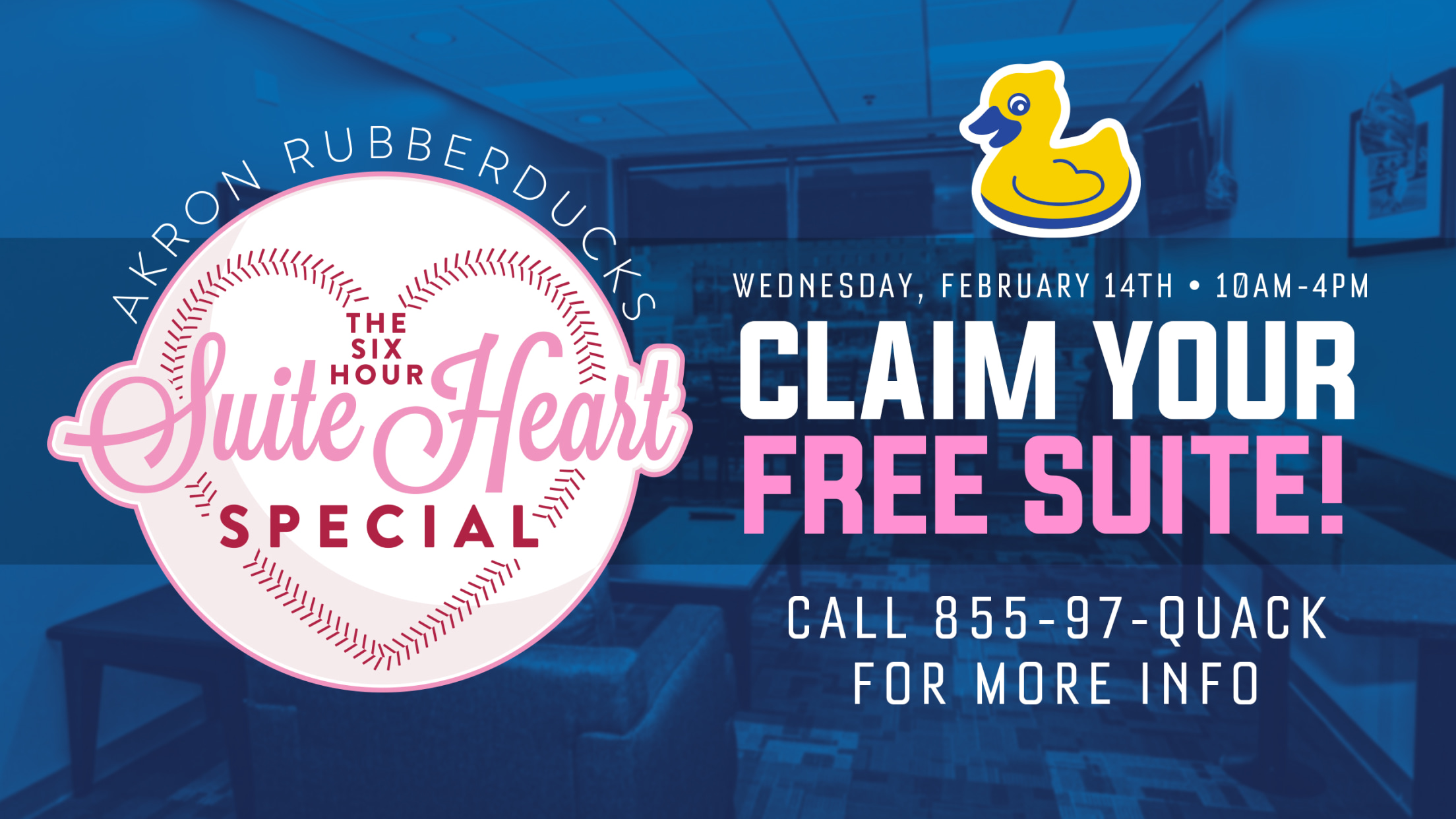 (AKRON, OHIO) February 1, 2024 – Its February in Akron, love is in the air and the fan-favorite Akron RubberDucks “Six-hour Suite Heart Special” returns Wednesday, Feb. 14, from 10 a.m. until 4 p.m.!