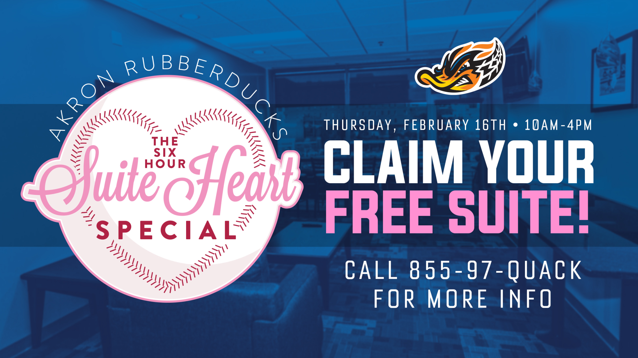 2023 Suite Heart Flyer (AKRON, OHIO) February 2, 2023 – Its February in Akron, snow is on the ground, love is in the air and the fan-favorite Akron RubberDucks “Six-hour Suite Heart Special” returns Thursday, Feb. 16, from 10 a.m. until 4 p.m.! During the “Suite Heart Special,” individuals and