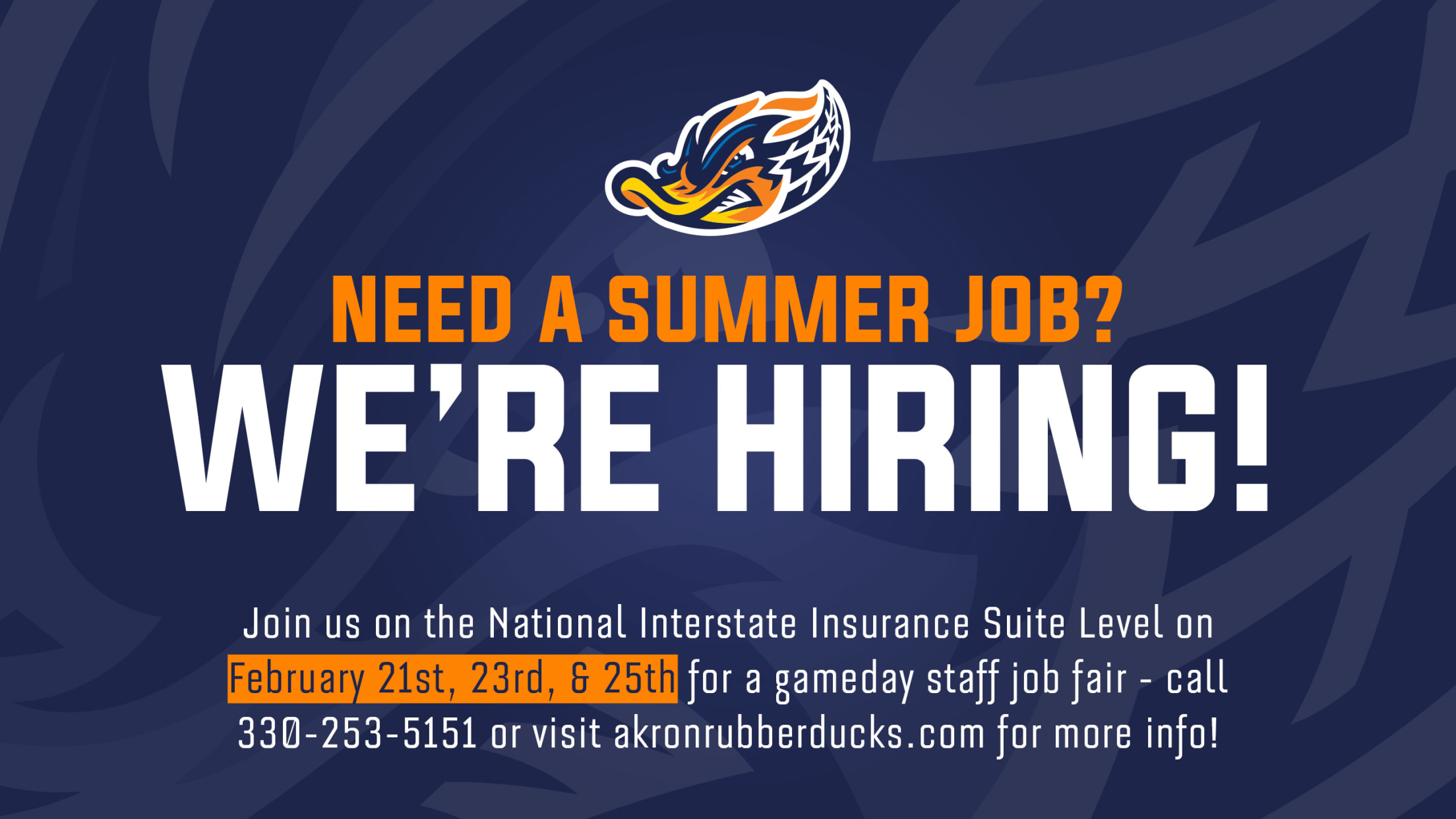 (AKRON, OHIO) February 6, 2023 – The Akron RubberDucks will host job fairs for a variety of gameday staff positions on Tuesday, Feb. 21 and Saturday, Feb. 25, The RubberDucks will also host Non-Profit Group Hiring Events on Thursday, Feb. 23 and Saturday, Feb. 25. All events will take place