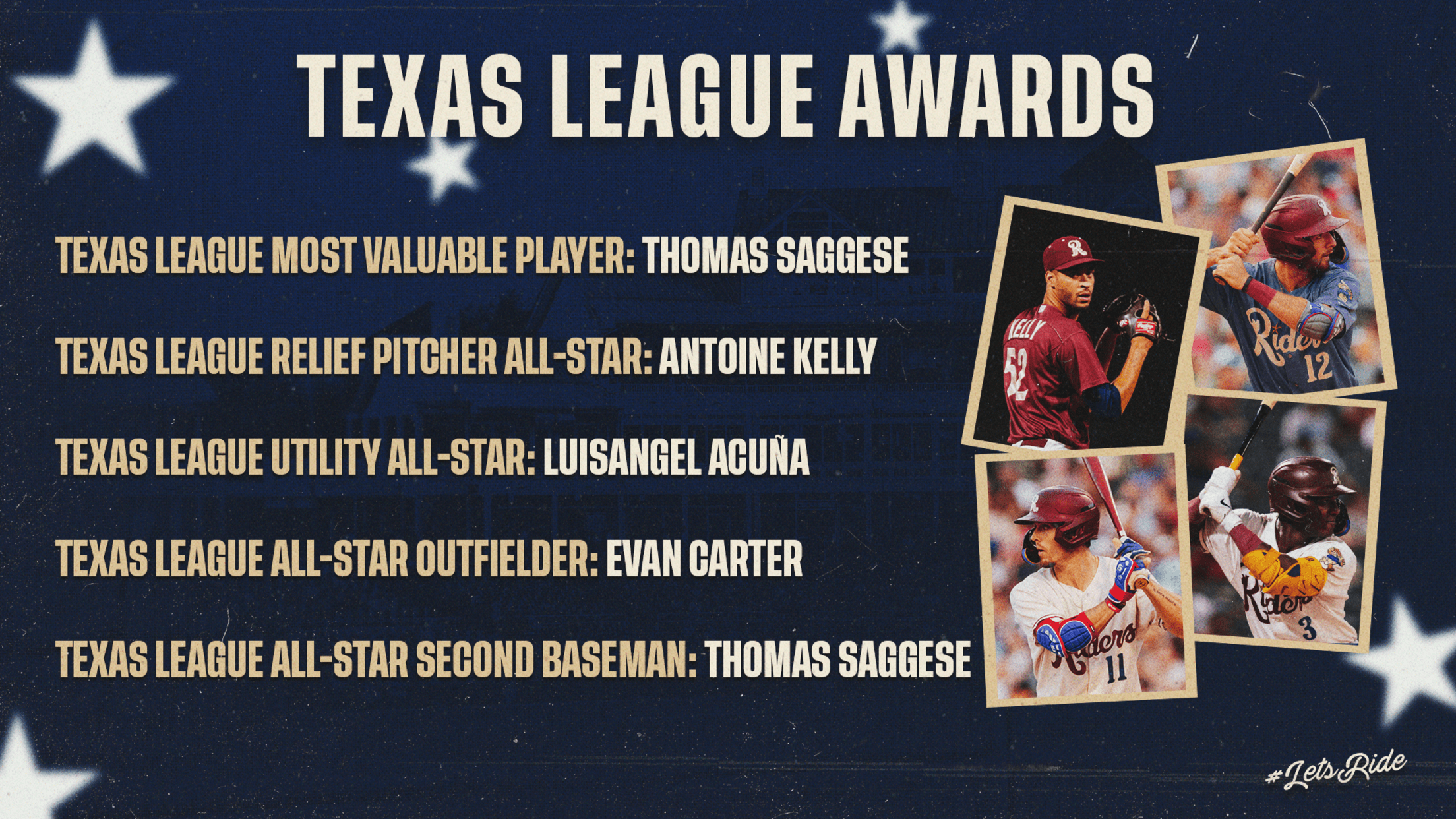 FRISCO, Texas (September 26, 2023) – On Tuesday, Minor League Baseball announced that the Frisco RoughRiders had four players named as 2023 Texas League All-Stars and infielder Thomas Saggese garnered MVP honors. Saggese was also named the All-Star at second base while Evan Carter was named an outfield All-Star, Luisangel Acuña was the utility All-Star and Antoine Kelly was a relief pitcher All-Star.