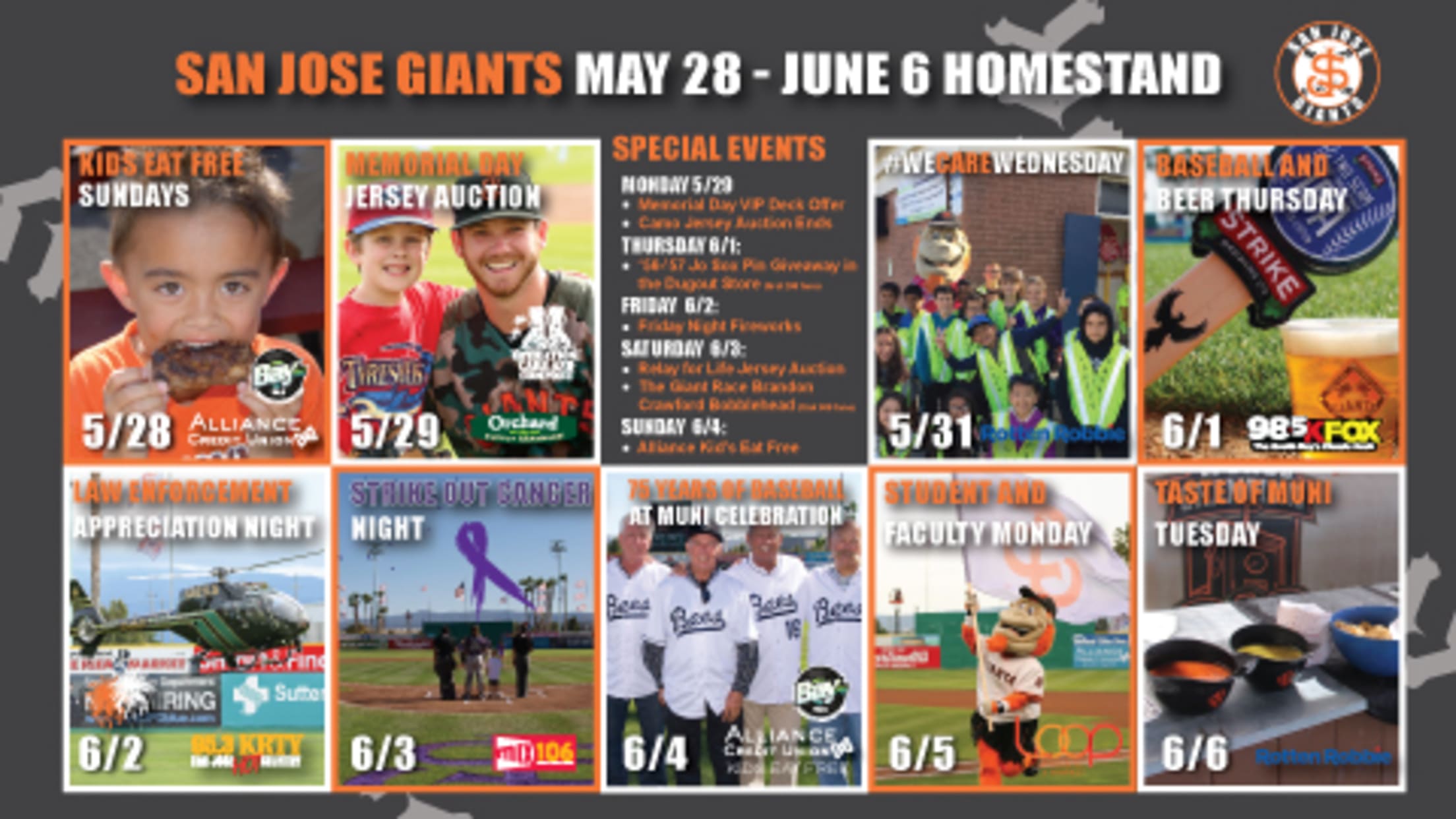 The Giants longest homestand of the season at Municipal Stadium also features some of the most exciting events, promotions and giveaways of the year. Help us kickoff summer with a special Memorial Day game May 29 as Operation: Care and Comfort teams with the Giants to deliver a special afternoon, complete with military themed uniforms and jersey auction. On June 2, Santa Clara County Sheriff's Office is proud to present Law Enforcement Appreciation Night at Municipal Stadium with departments such as SWAT, Bomb Squad teams and Search and Rescue featuring displays. The following day participants can take part in the San Jose Giant Race which finishes in centerfield at Muni. Later in the evening, our Giants host the Fourth Annual Strike Out Cancer Night. The team will wear special purple jerseys which can be bid on during the game with proceeds benefiting local cancer charities.
