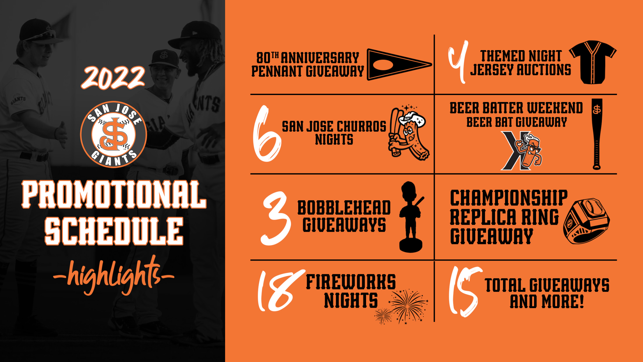 “2022 will be the Year of Celebration at Excite Ballpark,” said Matt Alongi, San Jose Giants Vice President of Marketing. “We are thrilled to fill our schedule honoring not only the 2021 Championship team, but also our beloved ballpark’s 80-year history. With a record number of firework shows and weekend giveaways, we know there is something for everyone as baseball returns for a full season in San Jose.”