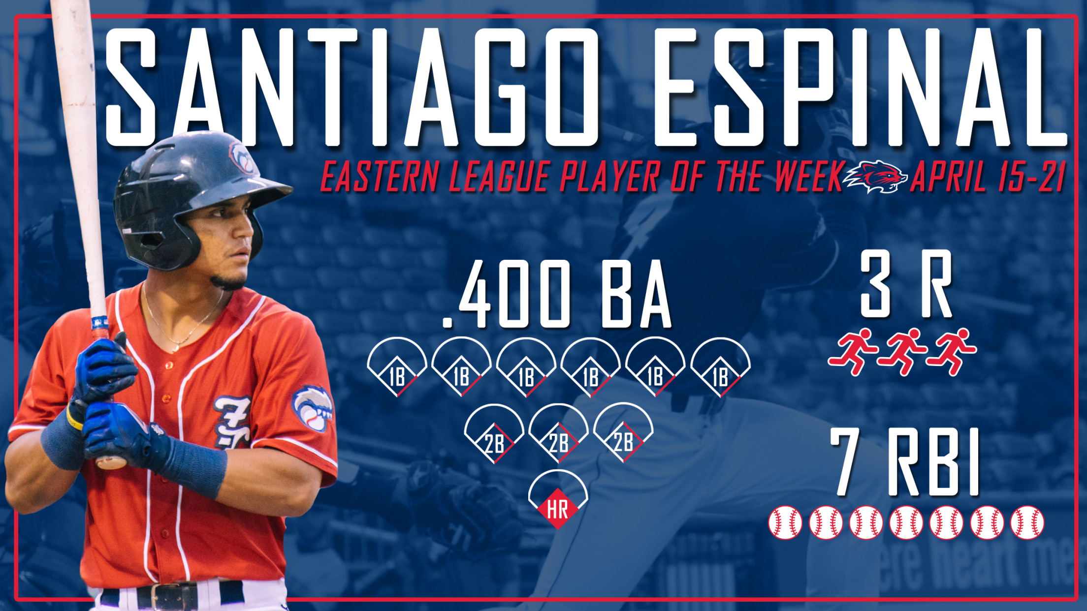 The 24-year-old Espinal enters Monday on a seven-game hitting streak, which he extended with a 3-for-5 night on Saturday in New Hampshire. He led Eastern League hitters with 10 hits and 16 total bases during his award-winning week, and finished second in RBIs (7), third in doubles (3), fourth in batting average (.400) and 10th in OPS (1.084).