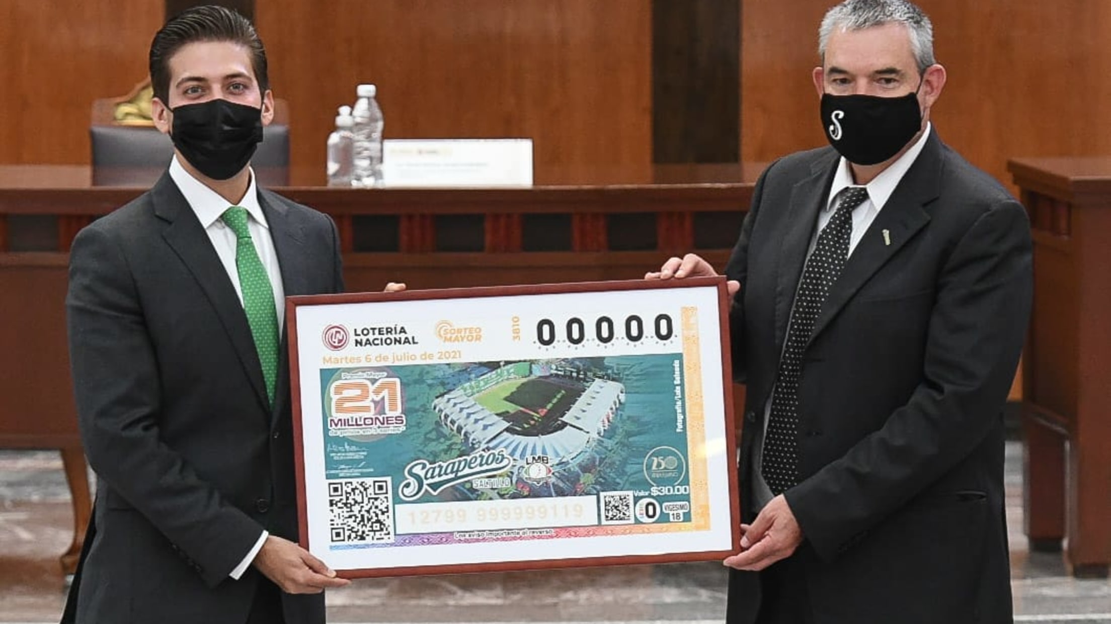 Ciudad de México (lmb.com.mx) La Lotería Nacional presentó el billete del Sorteo Mayor No. 3810, que tiene como motivo el 50º Aniversario de los Saraperos de Saltillo, equipo liderado inicialmente por don Jorge Torres Casso y que se integra a la Liga Mexicana de Beisbol (LMB) en 1970. El subdirector