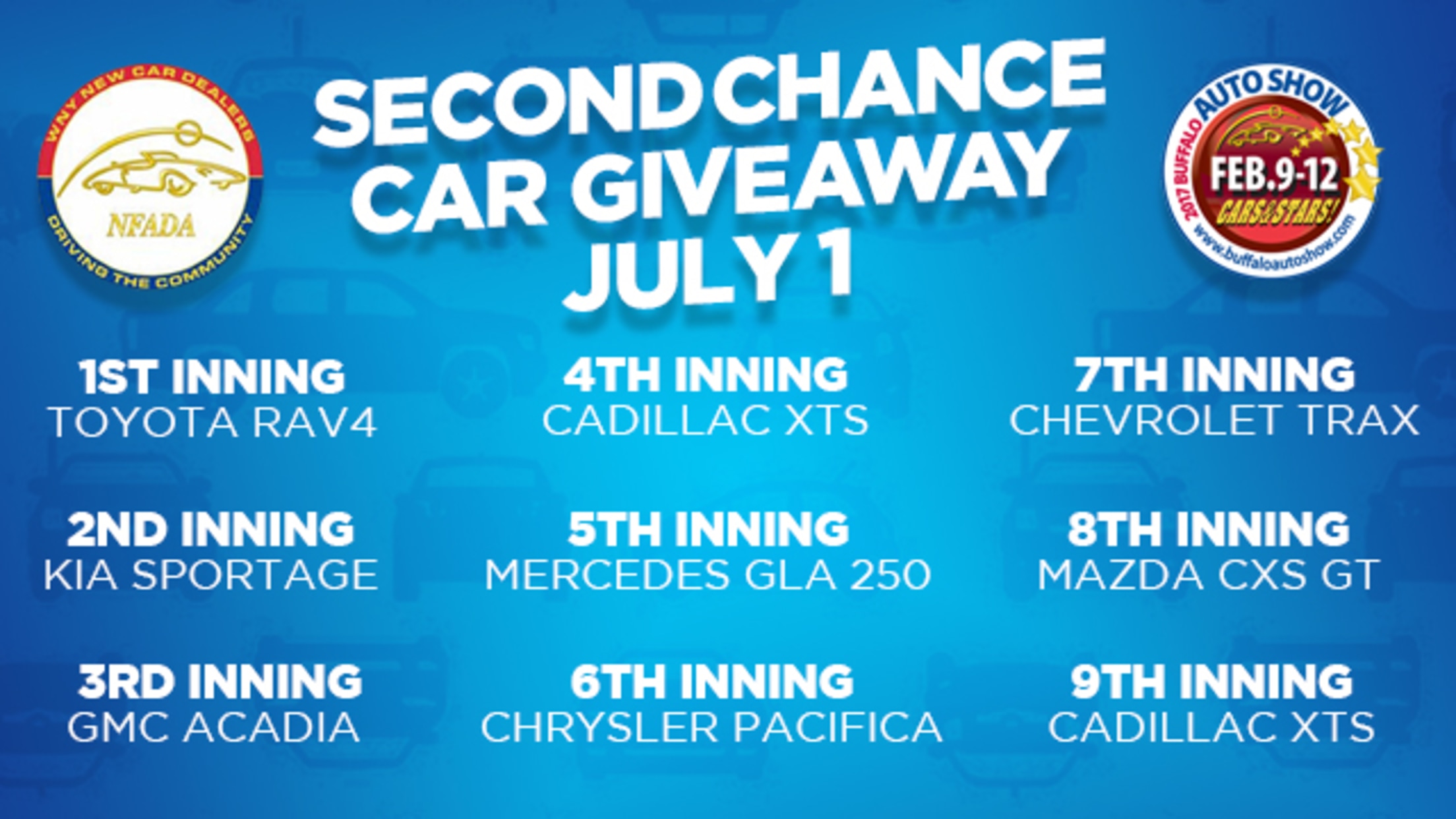 You enjoyed the plethora of new vehicles at this year's Buffalo Auto Show, and here is your chance to win one! There will be nine opportunities, one for each inning, to drive home in a new vehicle!