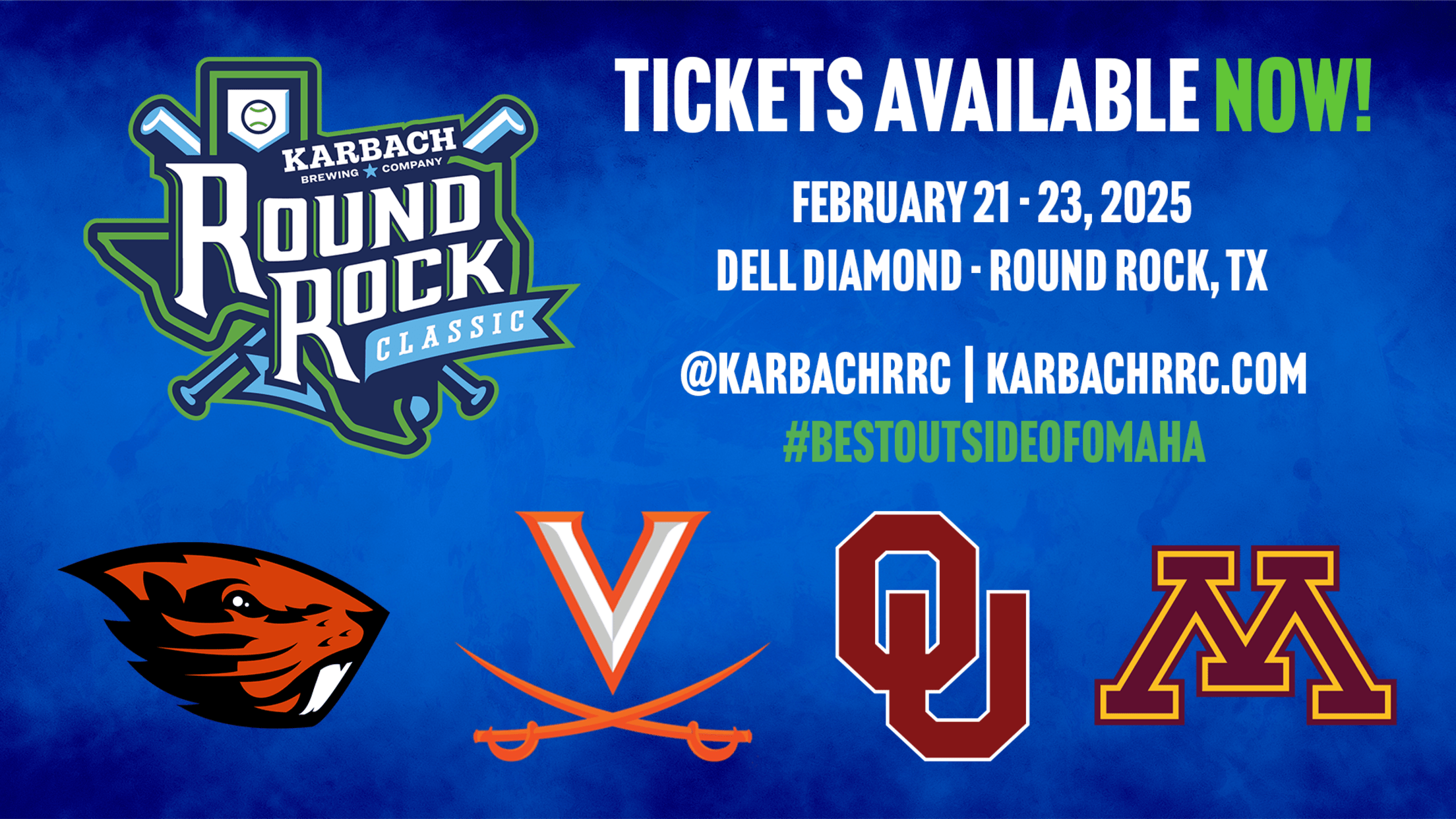 ROUND ROCK, Texas – Peak Events, LLC, in partnership with Karbach Brewing Company, Go Round Rock, and the Round Rock Express, is excited to announce the schedule for the sixth annual Karbach Round Rock Classic, set to return to Dell Diamond on February 21-23, 2025. The tournament will feature four top college baseball programs, including the University of Minnesota, the University of Oklahoma, Oregon State University and the University of Virginia.