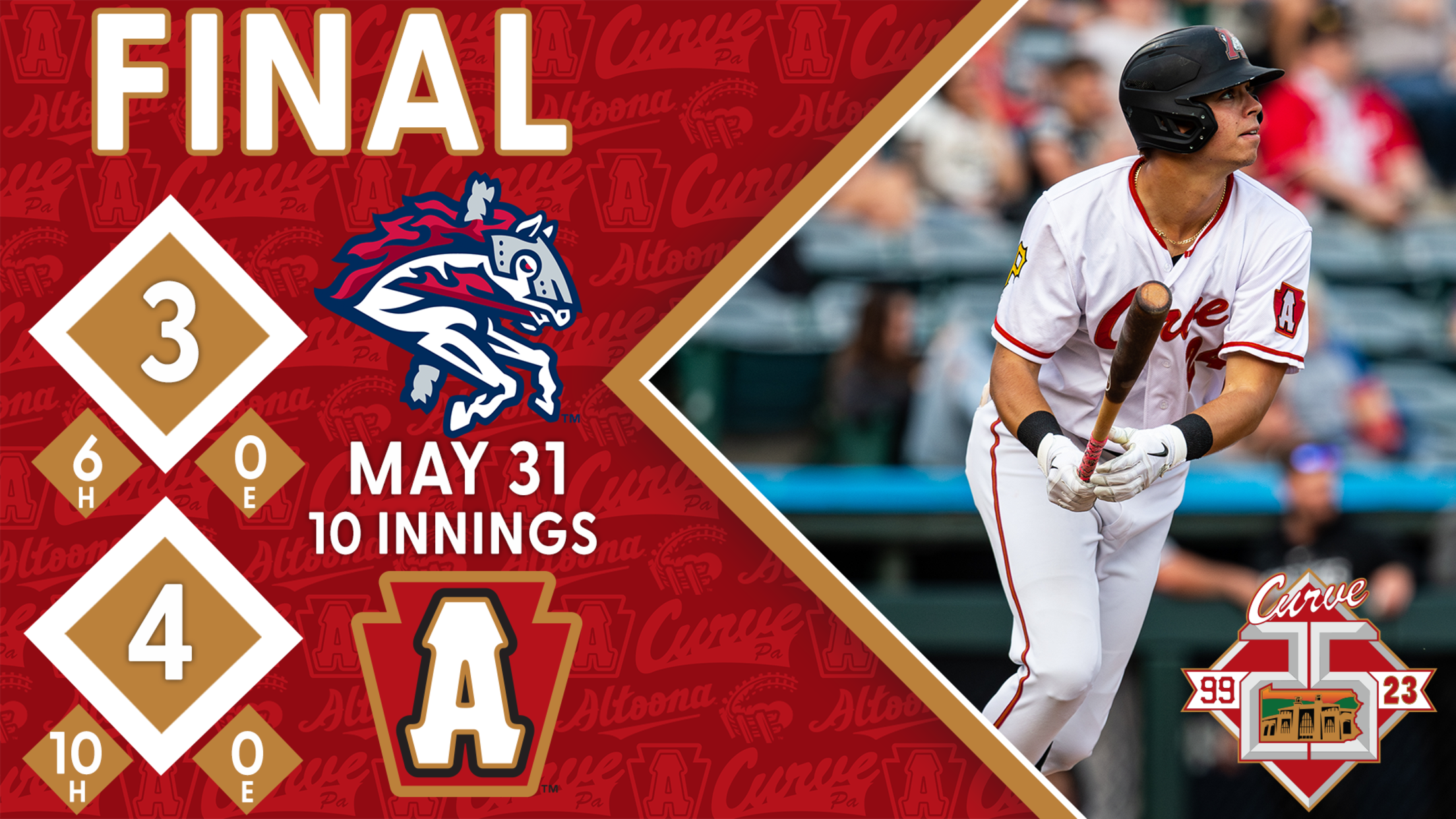 The Curve is proud to celebrate 25 years of memories in Curve, PA throughout the 2023 season. For tickets or more information, visit AltoonaCurve.com, call 877.99. CURVE or stop by the PNG Field box office. Additionally, the Stockyard Team Store is open Monday-Friday from 9 a.m. to 5 p.m. during every home game and online 24/7/365.