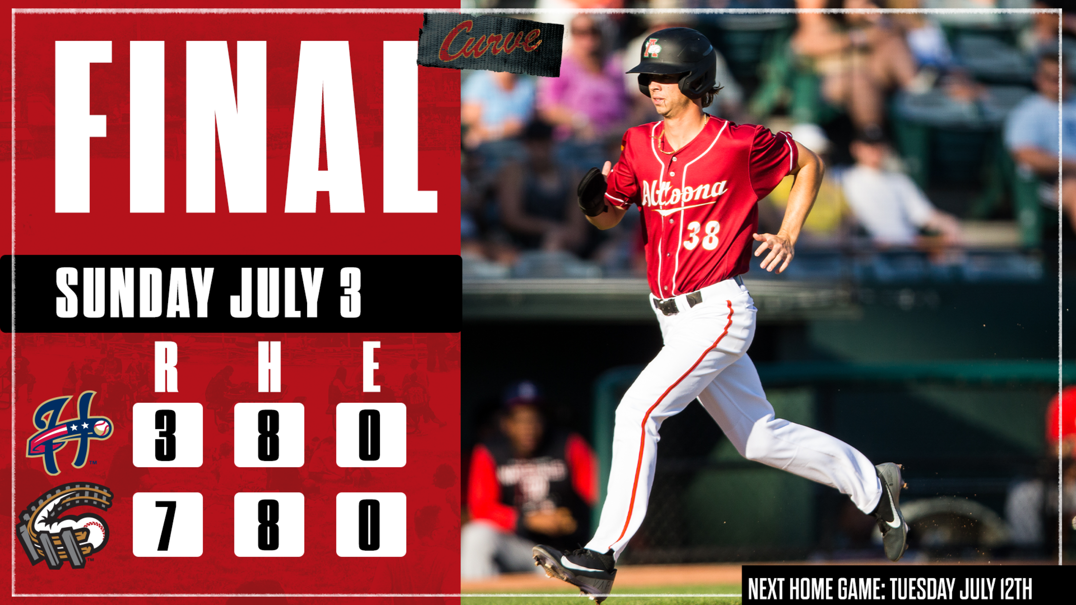 CURVE, Pa. – Connor Scott launched his second home run of the season to aid Altoona’s offense as the Curve defeated Harrisburg, 7-3, on Sunday night in a game that lasted one hour and 53 minutes in front of a season-high 8,344 fans at PNG Field.
