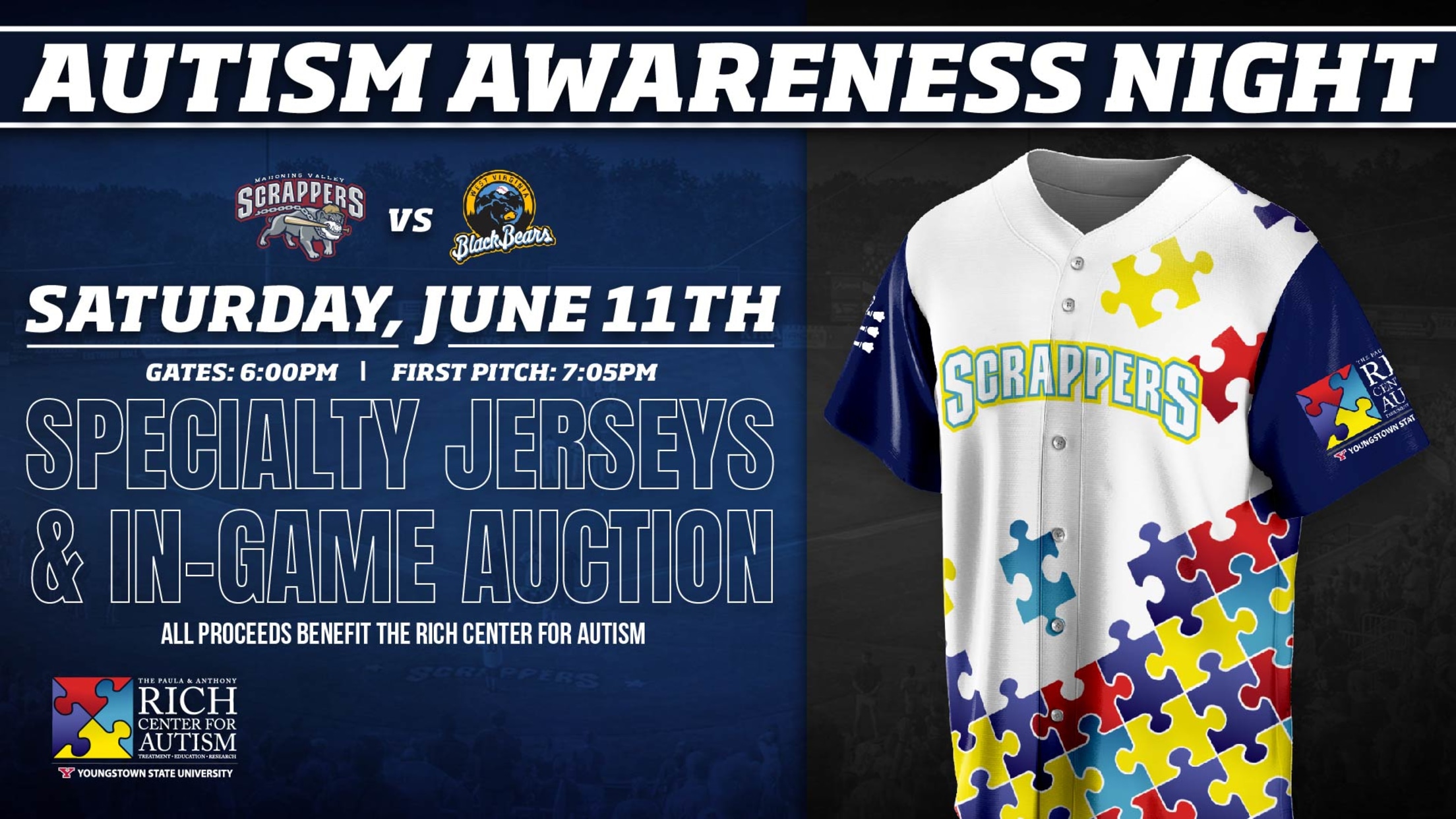 The Mahoning Valley Scrappers are excited to unveil the third of a series of five specialty jersey nights during the 2022 season. The Scrappers have partnered with the Rich Center for Autism to create a specialty jersey that the Scrappers players will wear for Autism Awareness Night on Saturday, June 11th against the West Virginia Black Bears. Game worn jerseys will be auctioned off in person at the game and also online at mvscrappers.com and LiveSource. Jersey proceeds will benefit the Rich Center for Autism.