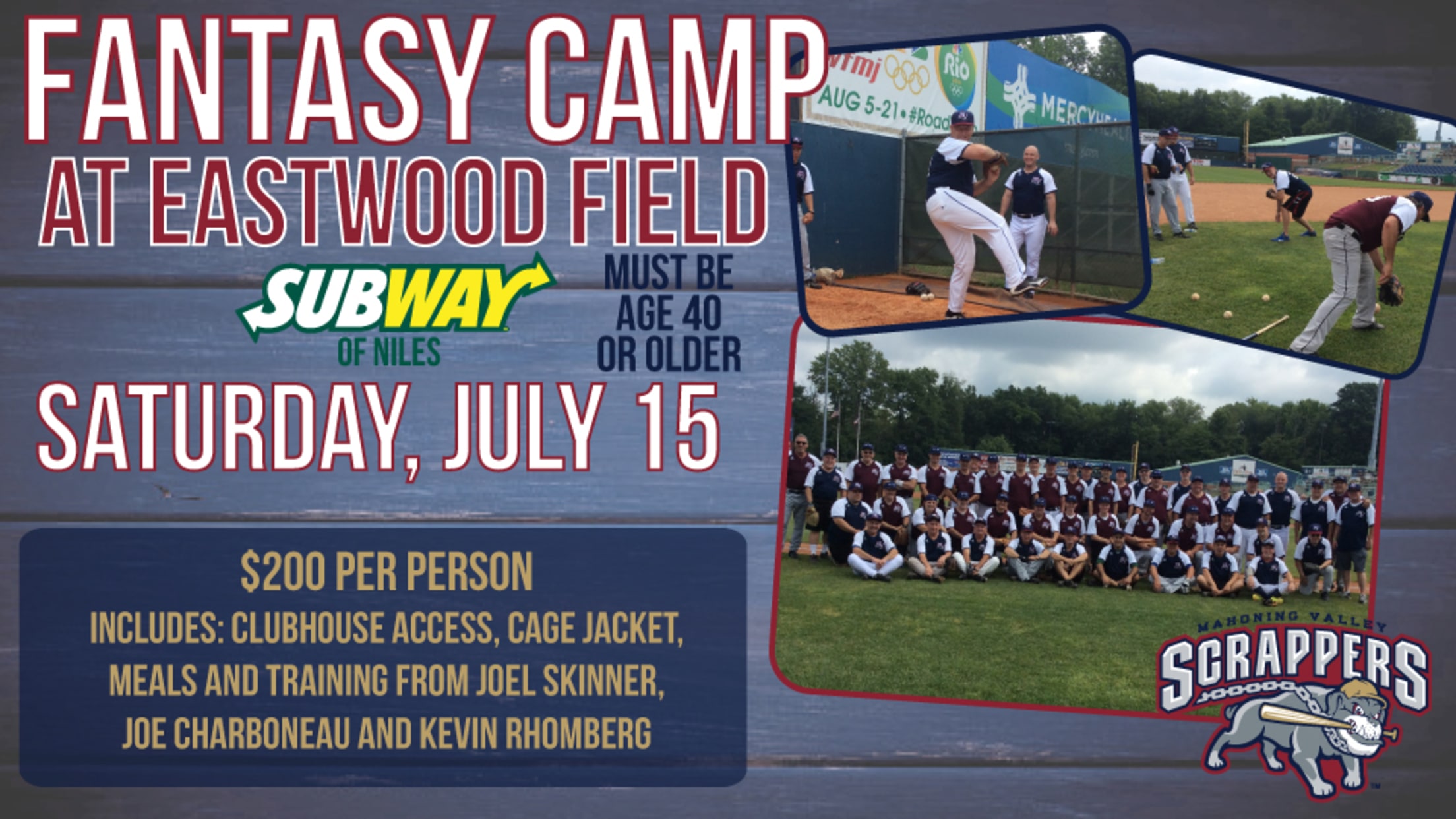 The Mahoning Valley Scrappers will host a Fantasy Camp at Eastwood Field on Saturday, July 15, 2017 presented by Subway of Niles. The one-day camp will feature three Cleveland Indians' alumni, Joel Skinner, Joe Charboneau and Kevin Rhomberg.