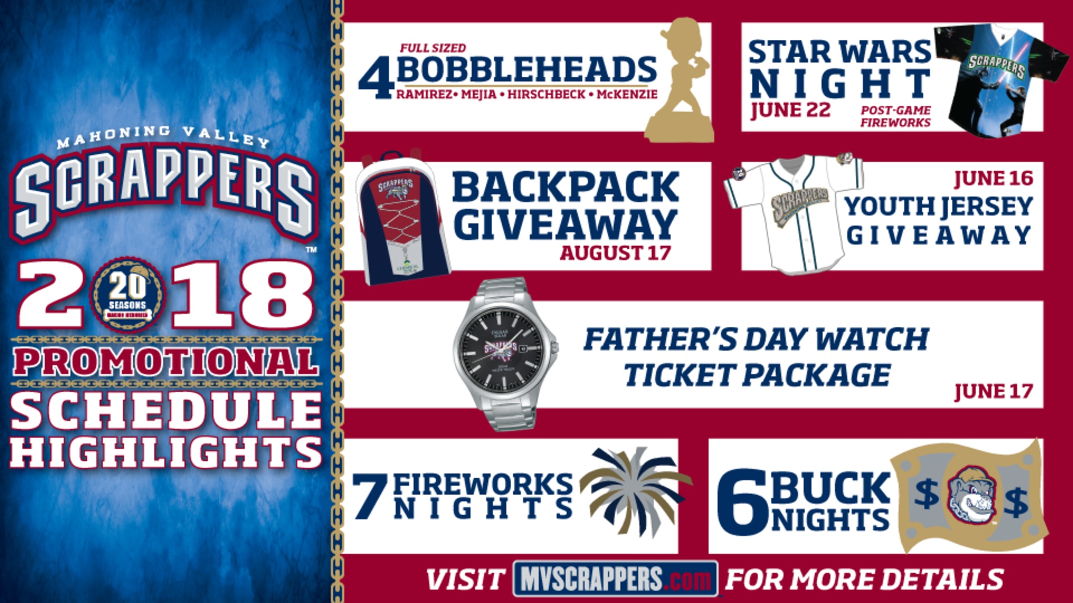 NILES, OH - The Mahoning Valley Scrappers are proud to announce a jam-packed promotional schedule for the 20th season at Eastwood Field. 2018 season highlights include seven post-game firework displays, four full-sized bobblehead giveaways, six Buck Nights and three specialty jersey nights.