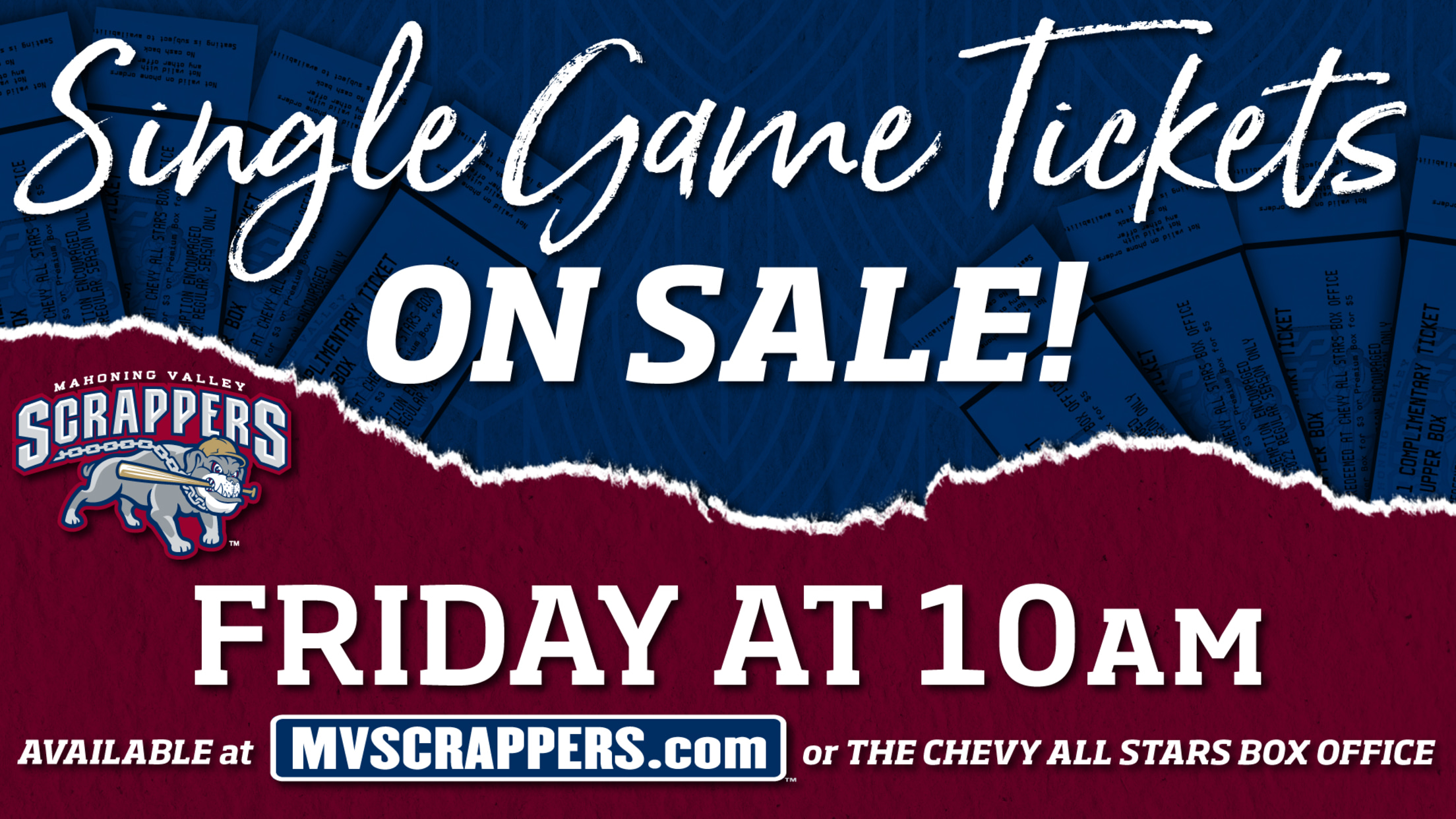 Mahoning Valley Scrappers single-game tickets will go on sale Friday, April 15, 2022, at 10 am. Tickets will be available online at www.mvscrappers.com, by calling 330-505-0000, or at the Chevy All-Stars Box Office at Eastwood Field. Single-game ticket prices range from $9 to $14.