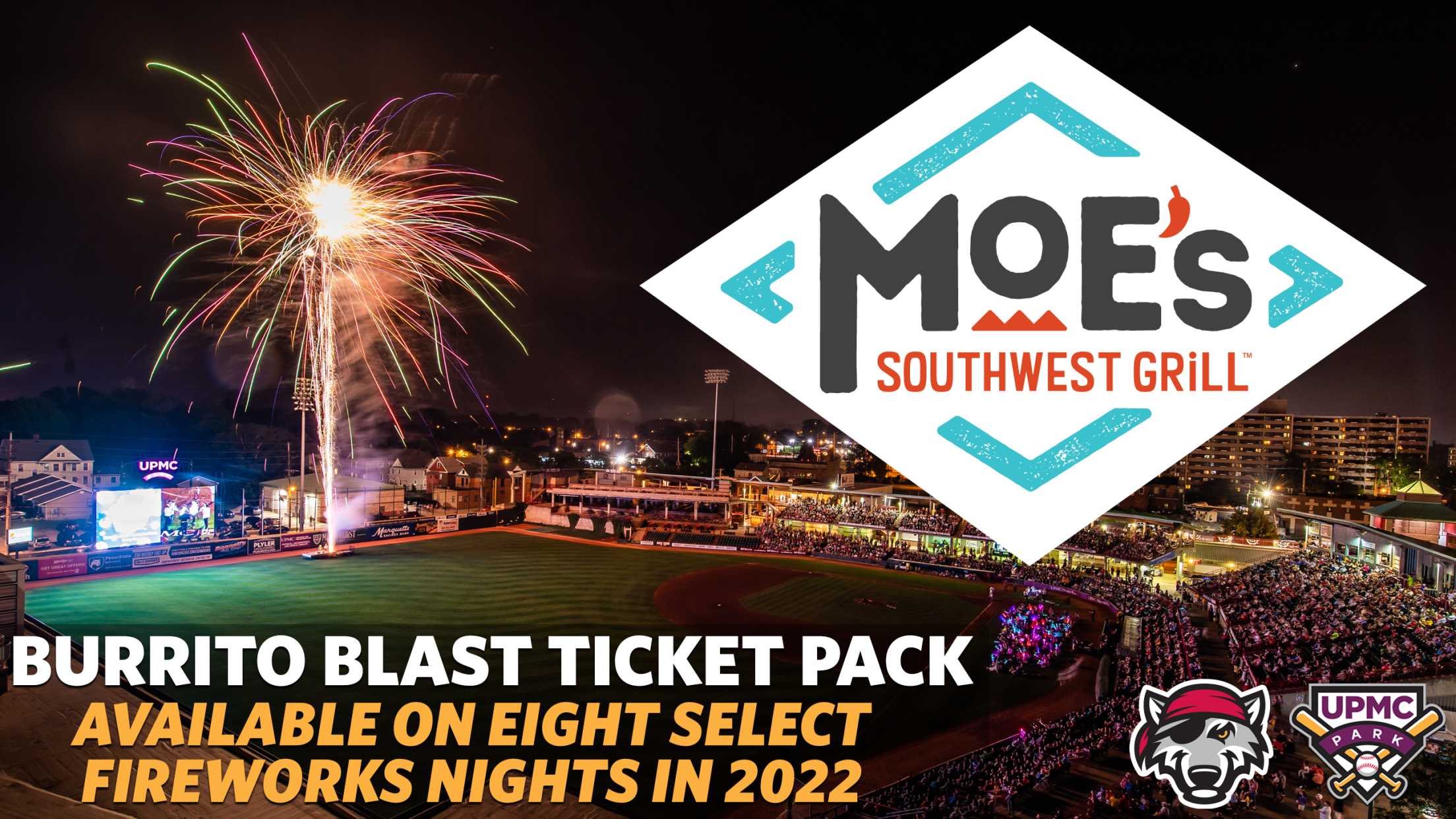For select fireworks games during the 2022 season, fans will be able to purchase the Moe’s Burrito Blast, which includes two SeaWolves Upper Box Seat game tickets and two vouchers each redeemable for a burrito at Erie area Moe’s Southwest Grill locations. The Moe’s Burrito Blast is valued at up to $50 and can be purchased for only $30. Fans will receive their SeaWolves game tickets and burrito vouchers upon purchasing the Moes’s Burrito Blast at the UPMC Park box office. Online ticket buyers can pick up their Moe’s burrito vouchers at the UPMC Park Advance Ticket window on the night of their game. Packages will be limited to the first 250 buyers for each game date and all purchases must be made prior to the day of the game.