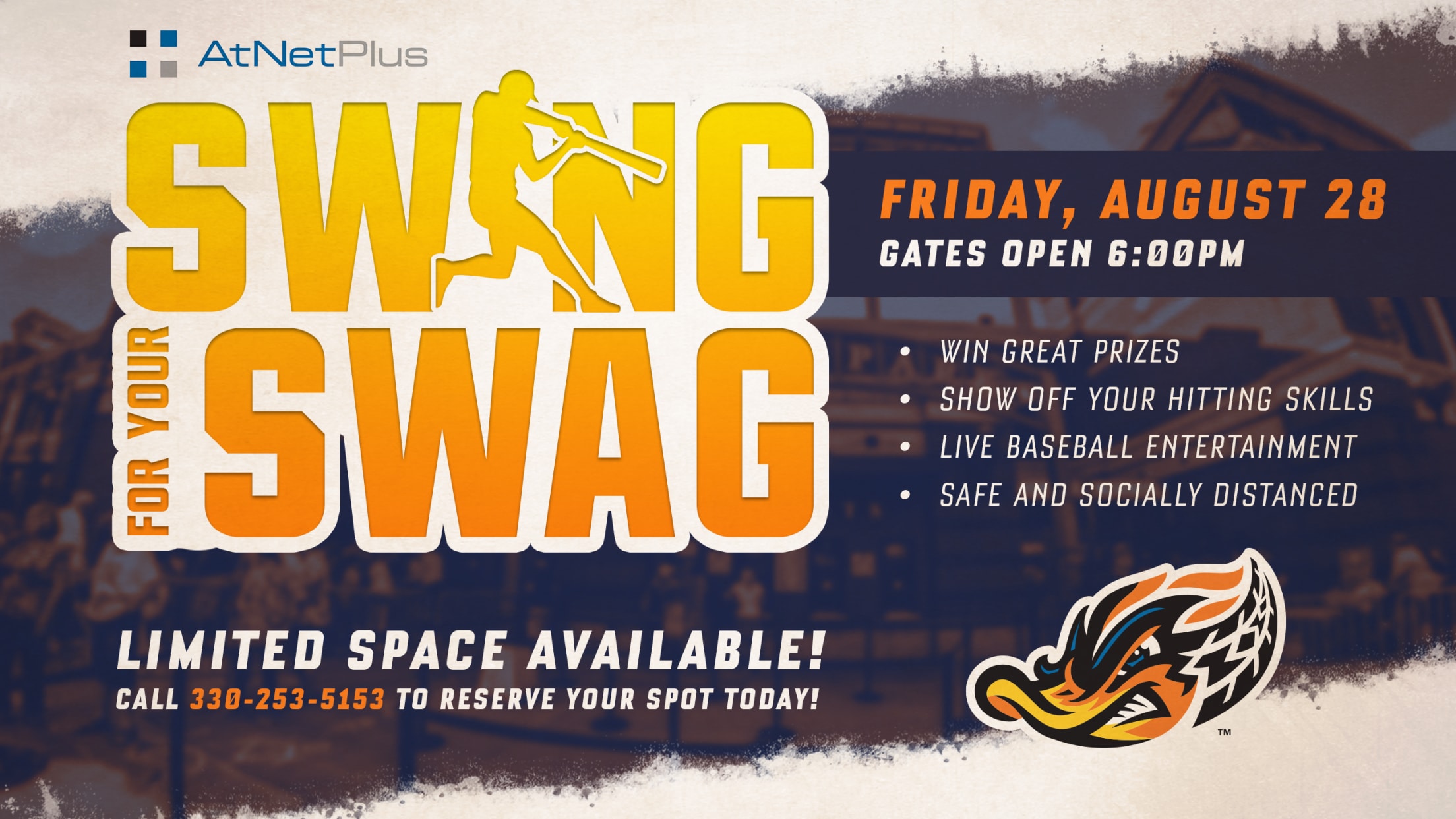 (AKRON, OHIO) August 20, 2020 – Back by popular demand, the Akron RubberDucks will host their second safe, socially-distanced “Swing for your Swag” event of the summer August 28, presented by AtNetPlus. All RubberDucks fans in attendance will have the opportunity to show off their skills and win great prizes during batting practice on the field at Canal Park by hitting a baseball into designated tiered zones in the outfield within 90 seconds. Gates open for this exciting event at 6 p.m. as RubberDucks fans will have the opportunity to take batting practice and enjoy live baseball entertainment afterwards at Canal Park.