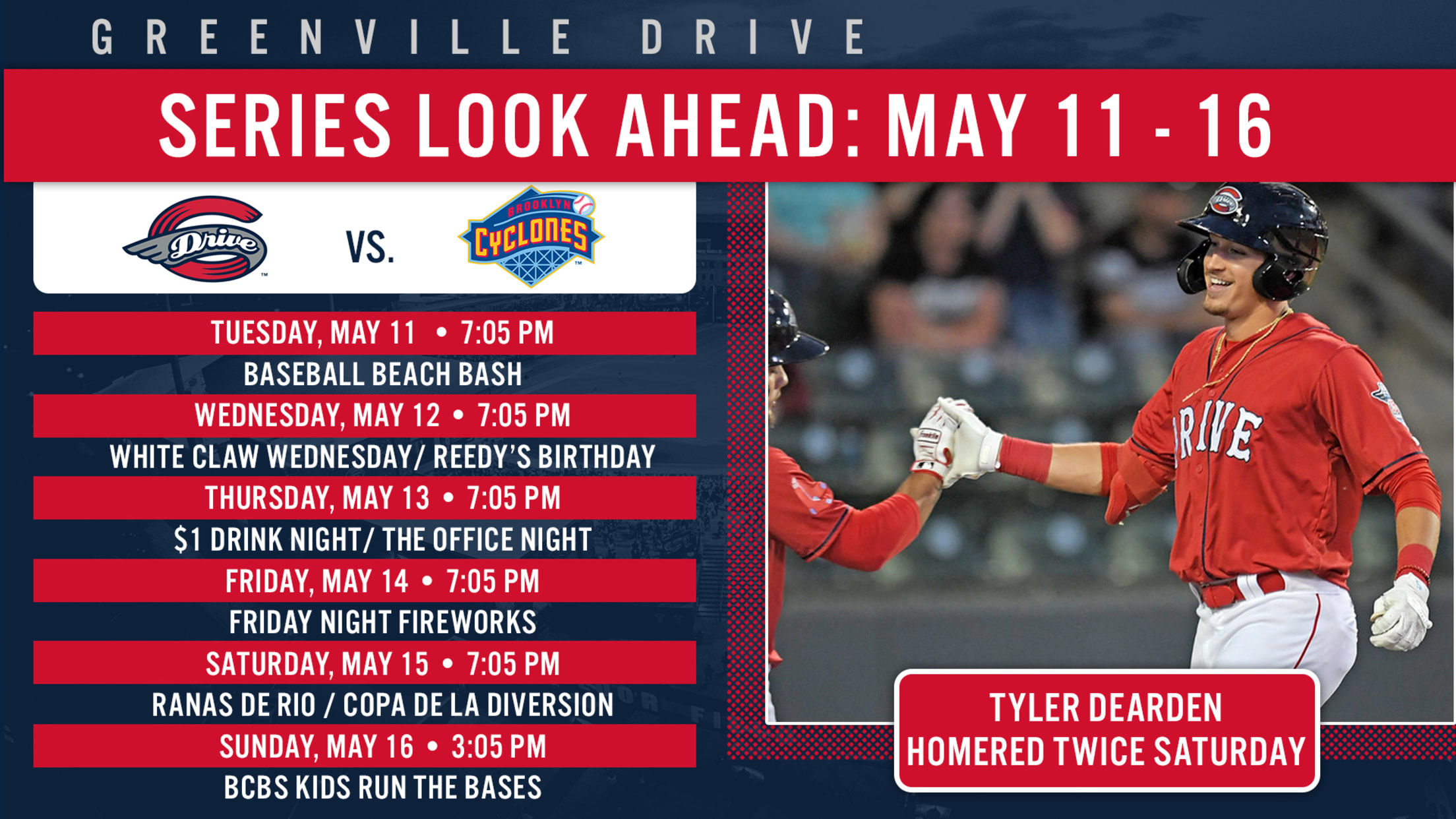 The first homestand of the Greenville Drive’s 15th Anniversary Season continues on Tuesday May 11th as the Drive welcome the Brooklyn Cyclones, Advanced A Affiliate of the New York Mets, to Greenville for the first-time ever. Drive baseball returned to Greenville in full force last week with excitement & energy