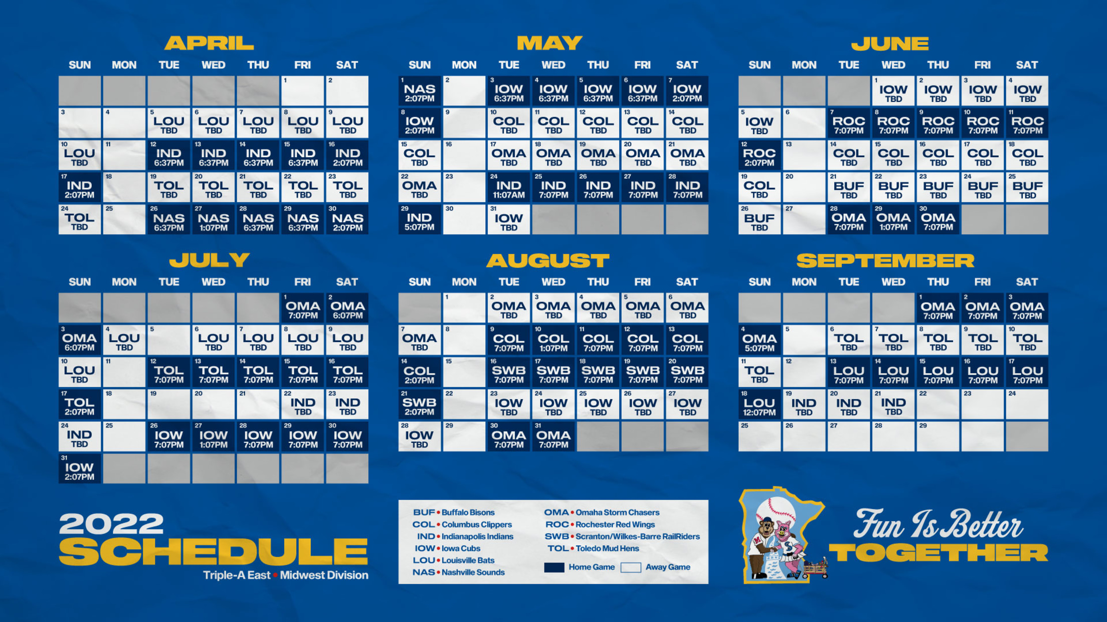 The Saints will host two, 12-game homestands with the first taking place from May 11-23 with a six-game series against a first-time opponent, the Nashville Sounds (Milwaukee Brewers) followed by a six-game series against the Iowa Cubs (Chicago Cubs). The Saints also have a 12-game homestand from August 9-21 against the Columbus Clippers (Cleveland Indians) and another first-time opponent, the Scranton/Wilkes-Barre RailRiders (New York Yankees).