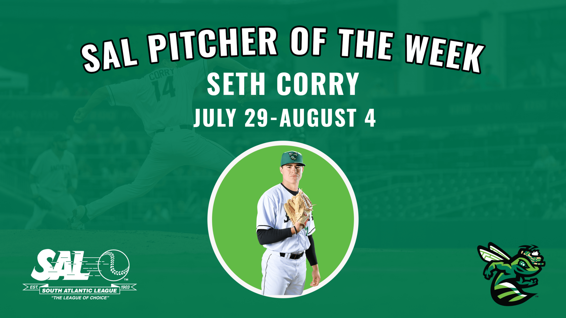 NORTH AUGUSTA, SC: The South Atlantic League has announced that Augusta GreenJackets starting pitcher, Seth Corry, has been named the SAL Pitcher of the Week for July 29th - August 4th. Corry delivered 12.2 innings of scoreless baseball. He also had 17 strikeouts to only one walk. The southpaw was