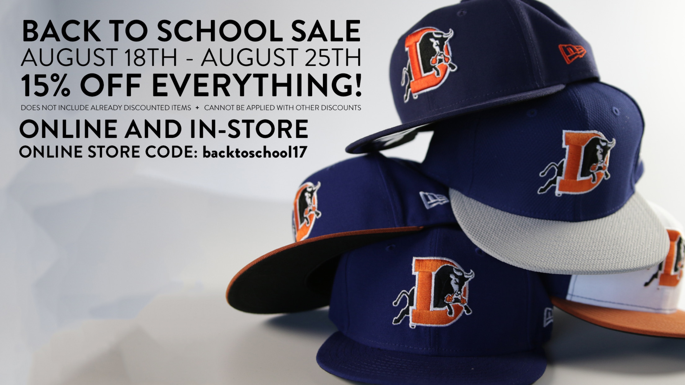 With the new school year right around the corner, get geared up with the Durham Bulls! From Friday, August 18 through Friday, August 25, get 15% off everything online or in the store! That's right - hats, shirts, sweatshirts, outerwear and more is 15% off whether online or in-person!If shopping