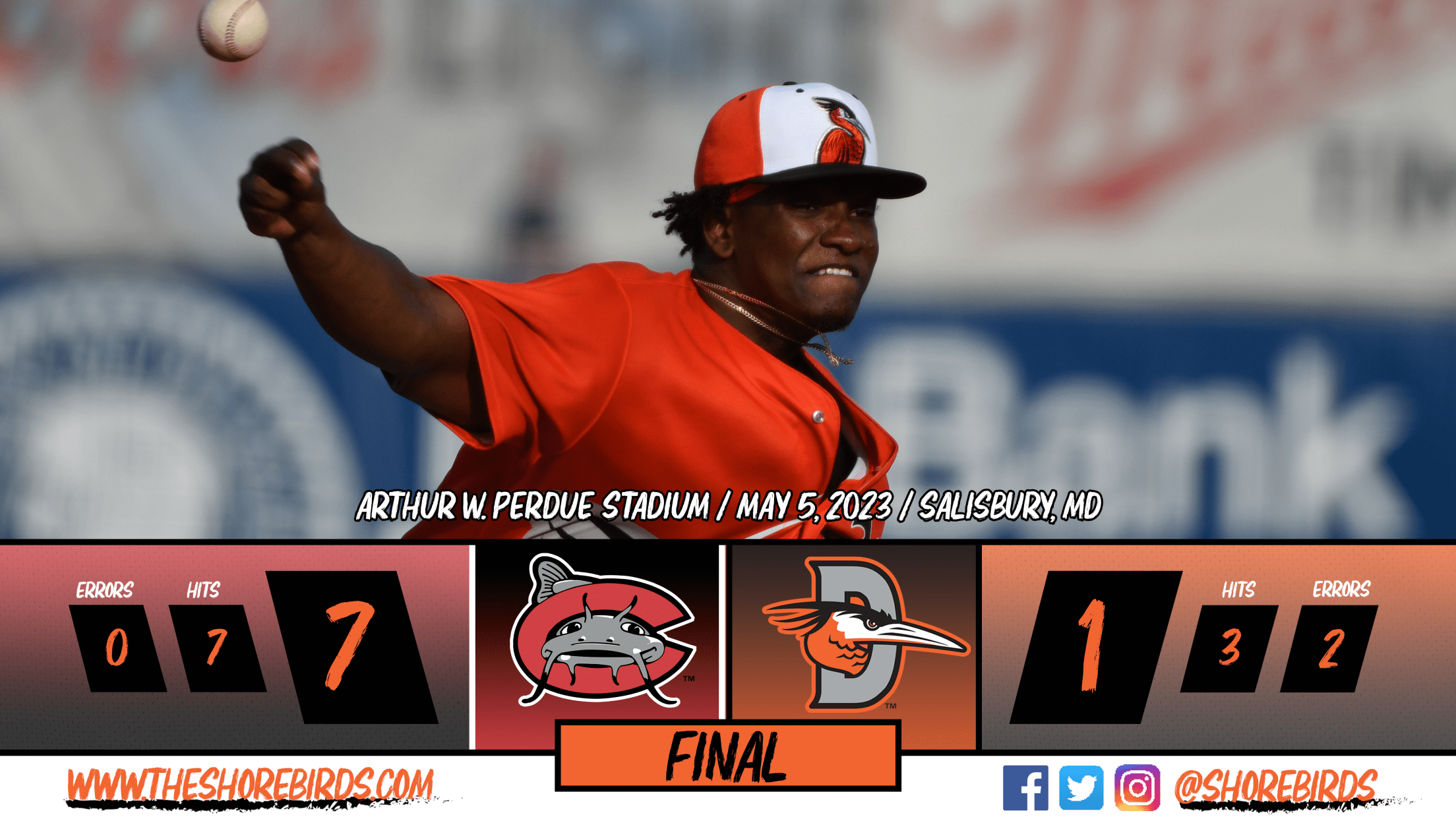 Shorebirds Lose Second Straight to Mudcats Carolina Pitching Dominates on Friday Night SALISBURY, MD: The Delmarva Shorebirds (13-10) were halted again by the Carolina Mudcats (14-9) on Friday night as the visitors earned their second straight win over the Shorebirds by a score of 7-1. Delmarva took an early first-inning