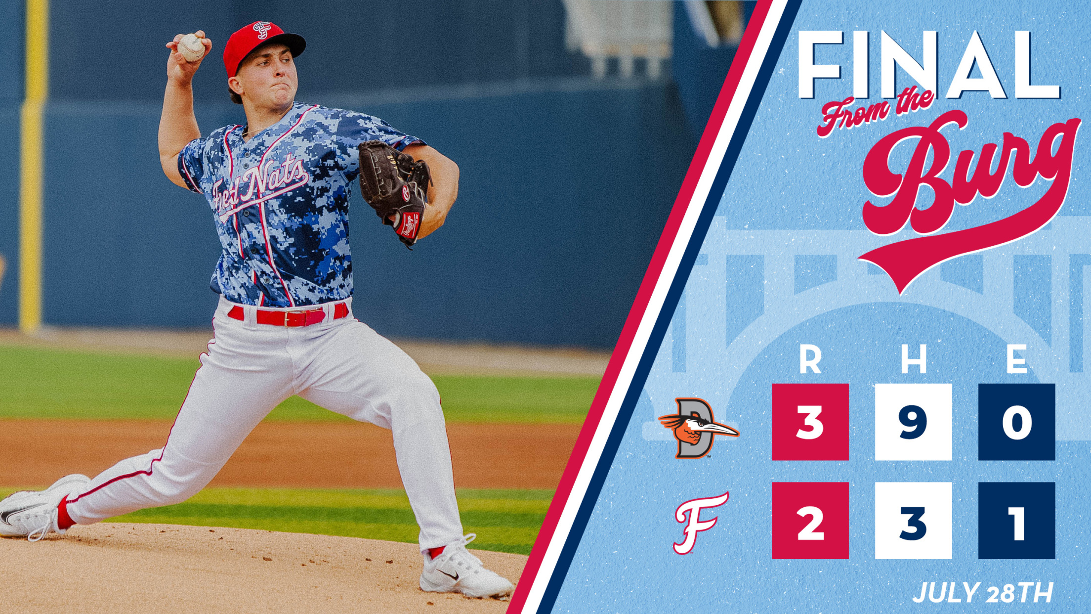 FREDERICKSBURG, VA - A late rally came up just short for the FredNats, as Delmarva won the series finale 3-2. FXBG is now 20-10 (55-41), and the ‘Birds are 13-17 (36-59).
