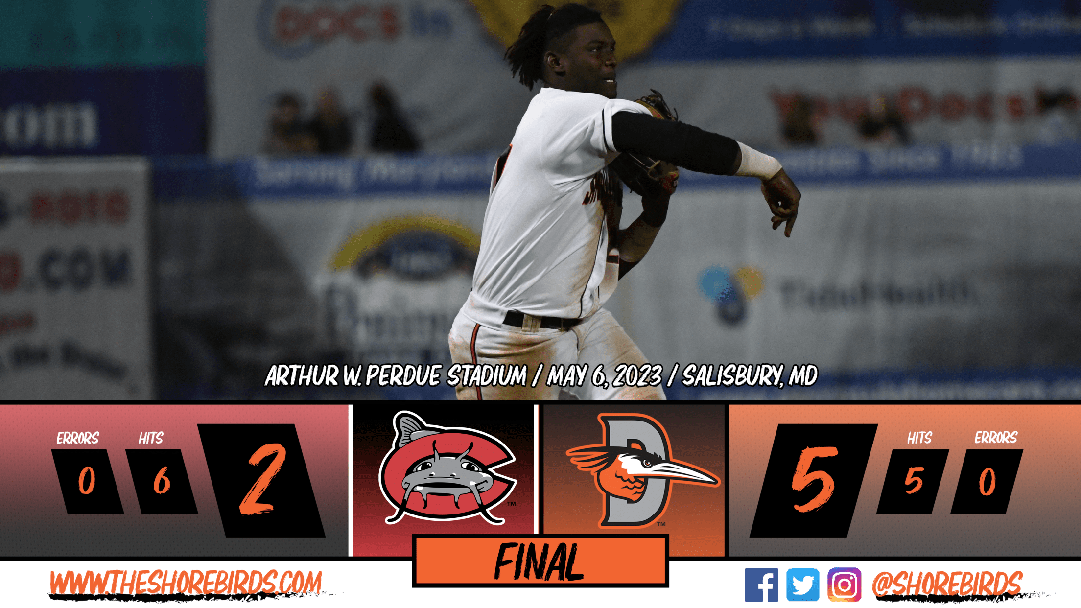 *SALISBURY, MD: *The Delmarva Shorebirds (14-10) returned to winning ways on Saturday night with a 5-2 victory over the Carolina Mudcats (14-10).