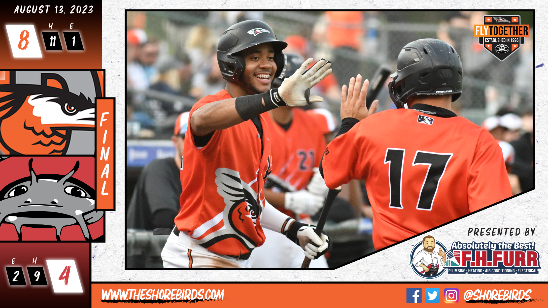 ZEBULON, NC: The Delmarva Shorebirds (17-24) concluded their series with the Carolina Mudcats (27-15) with an impressive offensive display on Sunday as they topped Milwaukee's Single-A affiliate with an 8-4 win.
