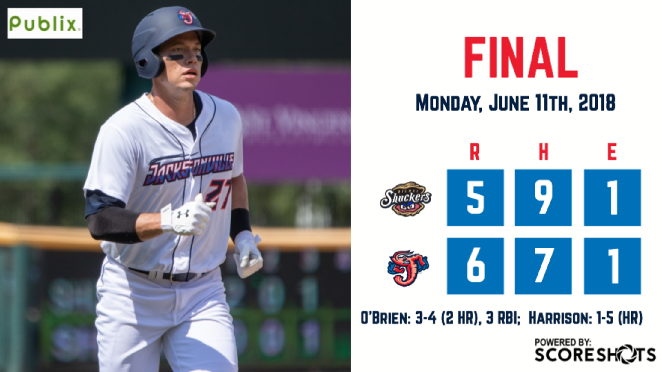 JACKSONVILLE, Fla. - Jacksonville Jumbo Shrimp first baseman Peter O'Brien homered twice - tying a Southern League record by homering in a sixth straight game - and All-Star center fielder Monte Harrison hit a three-run walk-off home run to defeat the Biloxi Shuckers, 6-5, in front of 2,712 and their