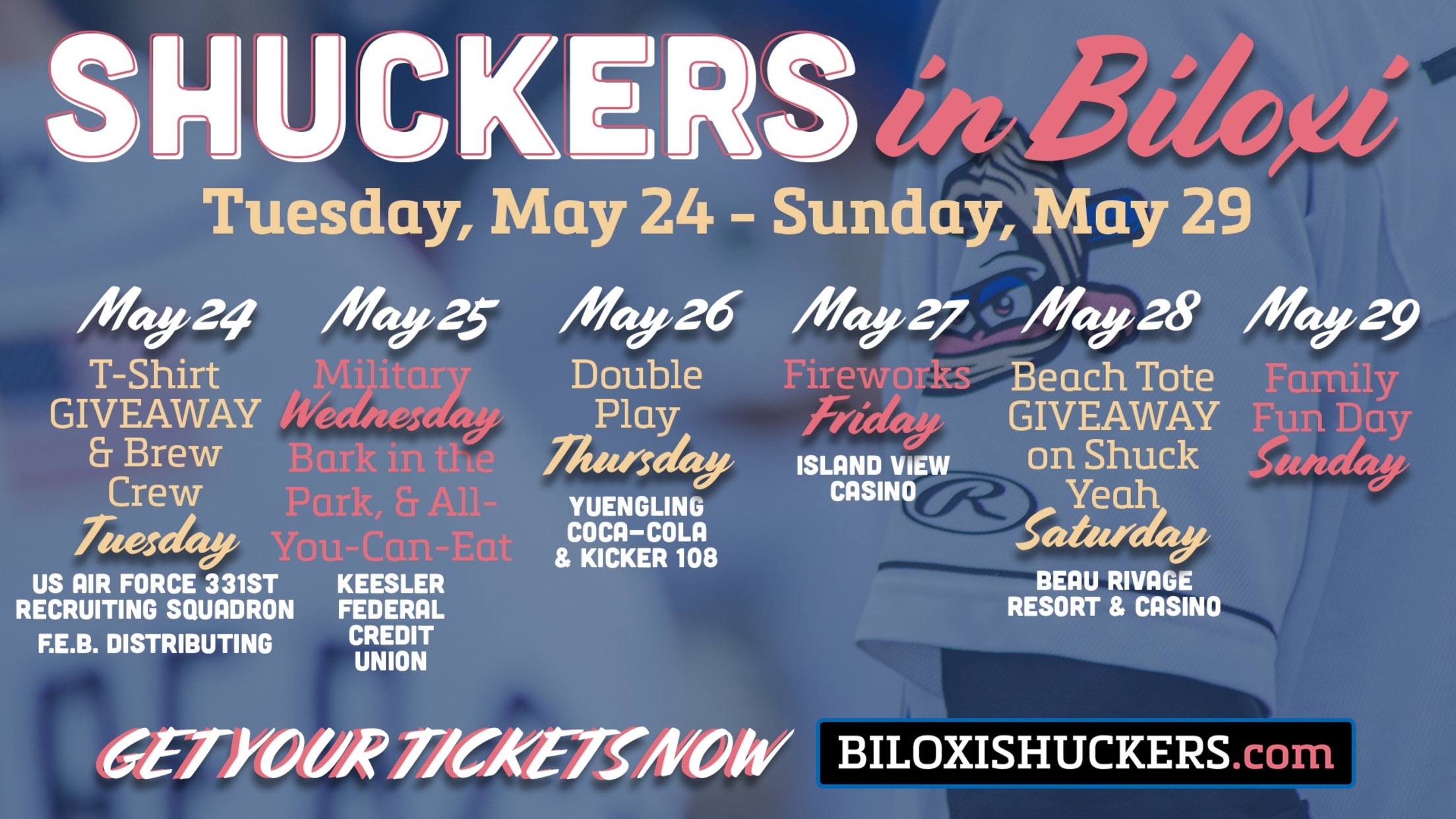 After a six-game road trip to Pearl, the Biloxi Shuckers return to MGM Park for a six-game series against the Montgomery Biscuits from Tuesday, May 24 to Sunday, May 29.