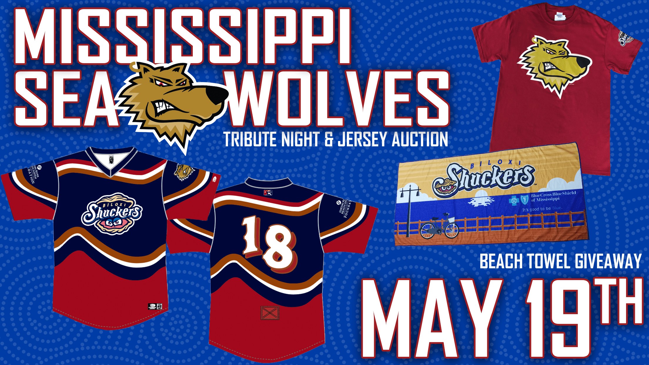 PURCHASE TICKETS HEREOn 'Mississippi Sea Wolves Tribute Night,' the Biloxi Shuckers players will wear special Hockey jerseys during the game, and an auction will be held during the game for fans to bid on the game-worn jerseys, with net proceeds benefiting the Singing River Health System Foundation. Emblazoned on the