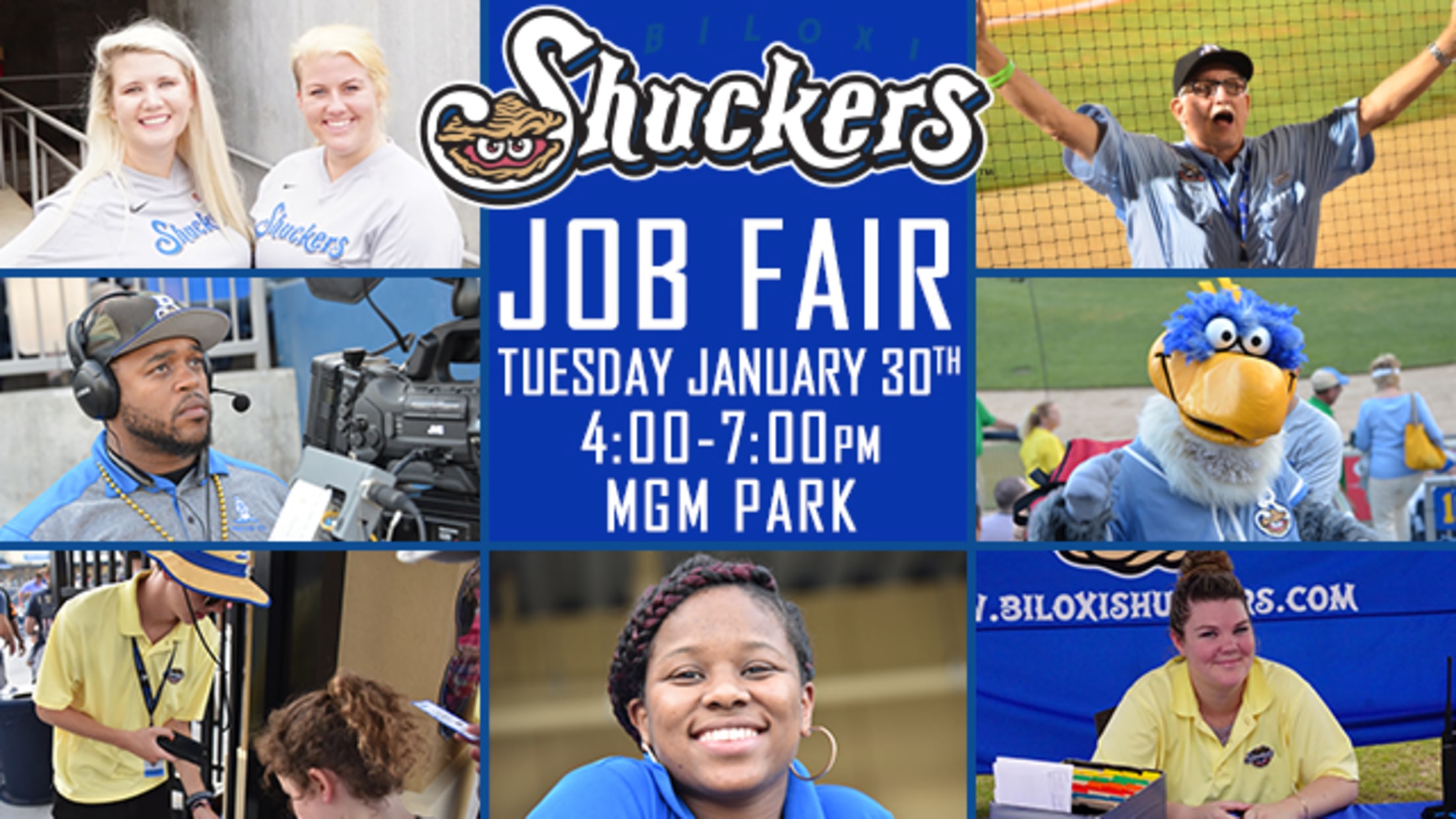 BILOXI, MS - The Biloxi Shuckers will be hosting its fourth annual job fair on Tuesday, January 30 from 4:00-7:00 pm at MGM Park, for part-time seasonal positions for the 2018 season. Shuckers concessionaire, Spectra by Comcast Spectacor, will hold a job fair at a later date. The Shuckers are looking for