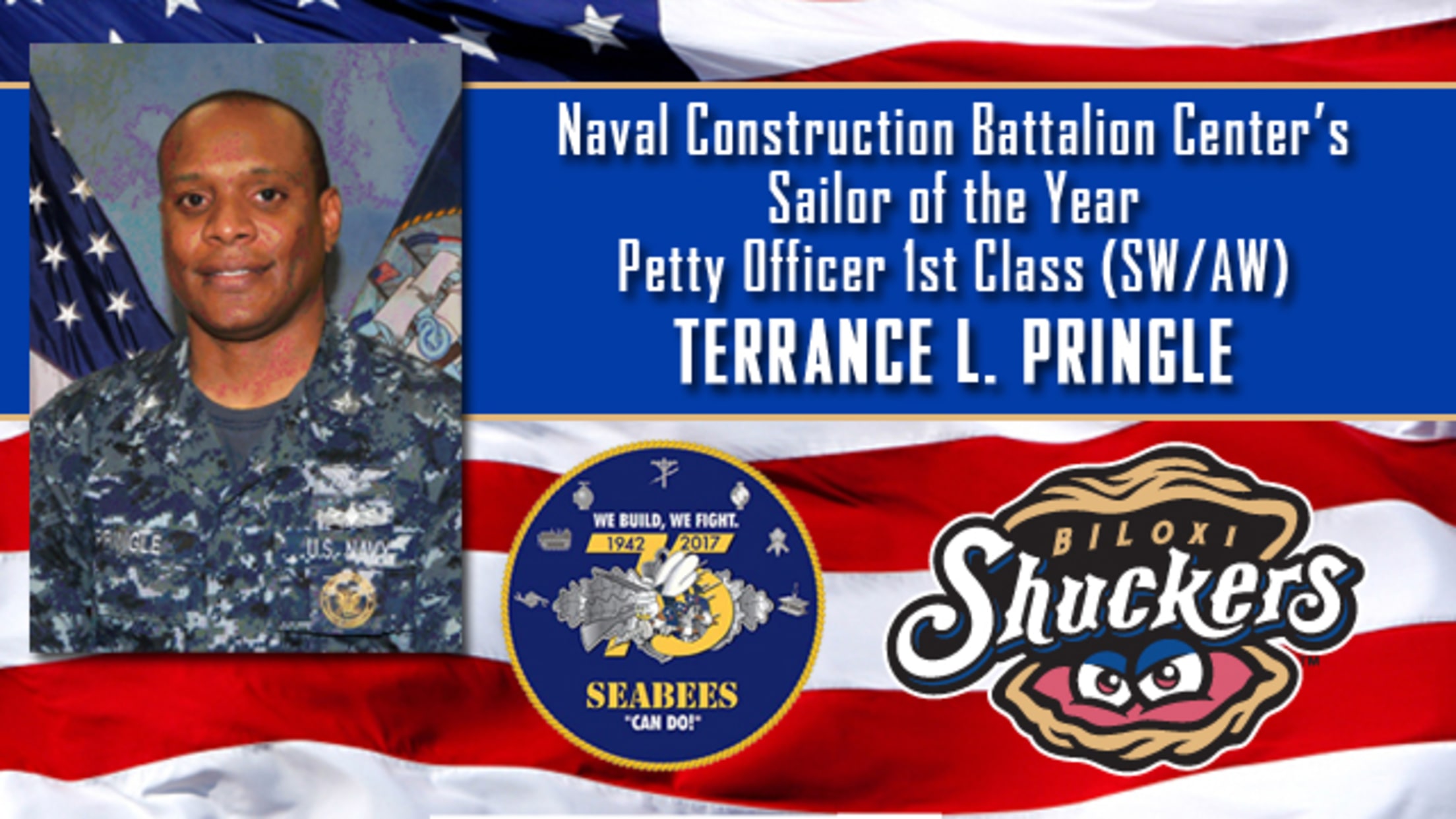 BILOXI, MS - Prior to tonight's 6:35 pm contest against the Montgomery Biscuits, the Shuckers will recognize Naval Construction Battalion Center's Sailor of the Year, Petty Officer 1st Class (SW/AW) Terrance L. Pringle.