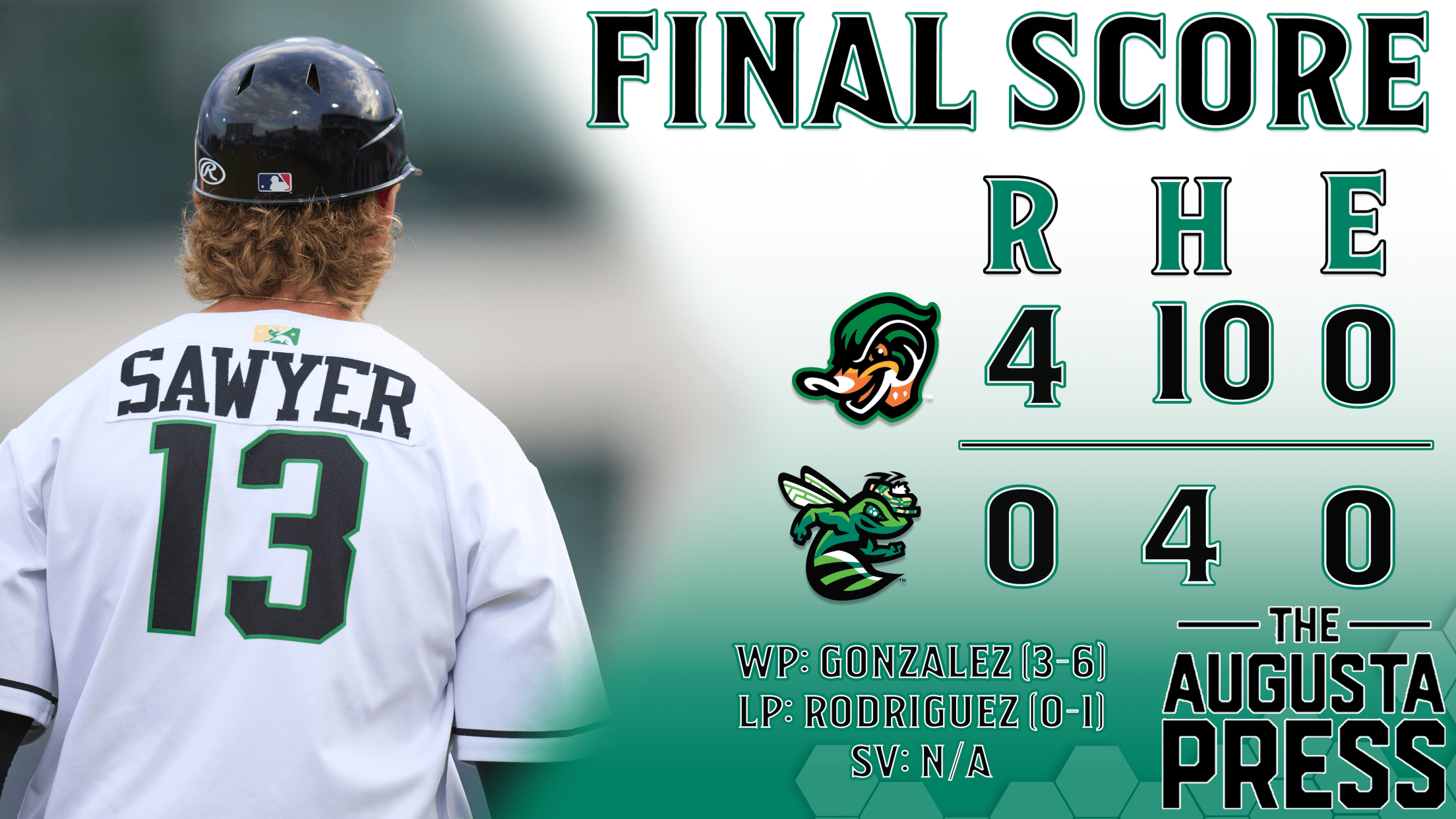 The day opened with some excitement for Augusta, who promoted 11 players up to the roster for either their full-season or professional debut. Five of those newcomers were in the lineup tonight, and three recorded their first professional hit. Patrick Clohisy from the University of St. Louis went 2-4 with a steal, Titus Dumitru of New Mexico State had a base hit and stolen base, and Colby Jones represented Northwest Florida State well by pounding out a single to add himself to the board.