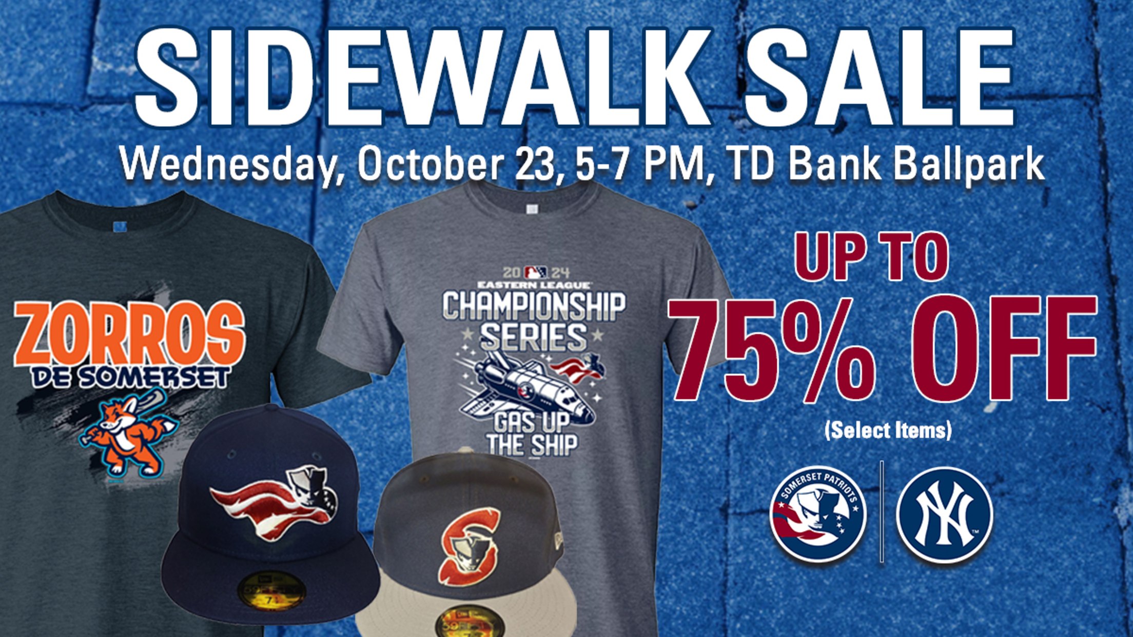Bridgewater, New Jersey - The Somerset Patriots, the New York Yankees Double-A affiliate, will be hosting a Sidewalk Sale at TD Bank Ballpark on Thursday, October 23 from 5:00 pm to 7:00 pm. Fans can save up to 75% off select items IN PERSON ONLY! Stop by the Patriots Team