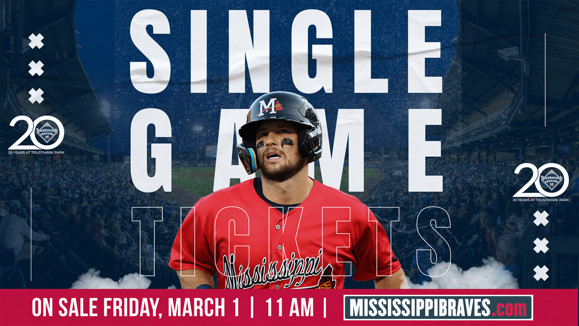 PEARL - Mississippi Braves single-game tickets for the 2024 season go on sale to the general public Friday, March 1 at 11:00 Am. Fans can purchase tickets to all 69 home games at mississippibraves.com/tickets via Ticketmaster, the TM app, or the Trustmark Park Box Office. Fans are encouraged to buy