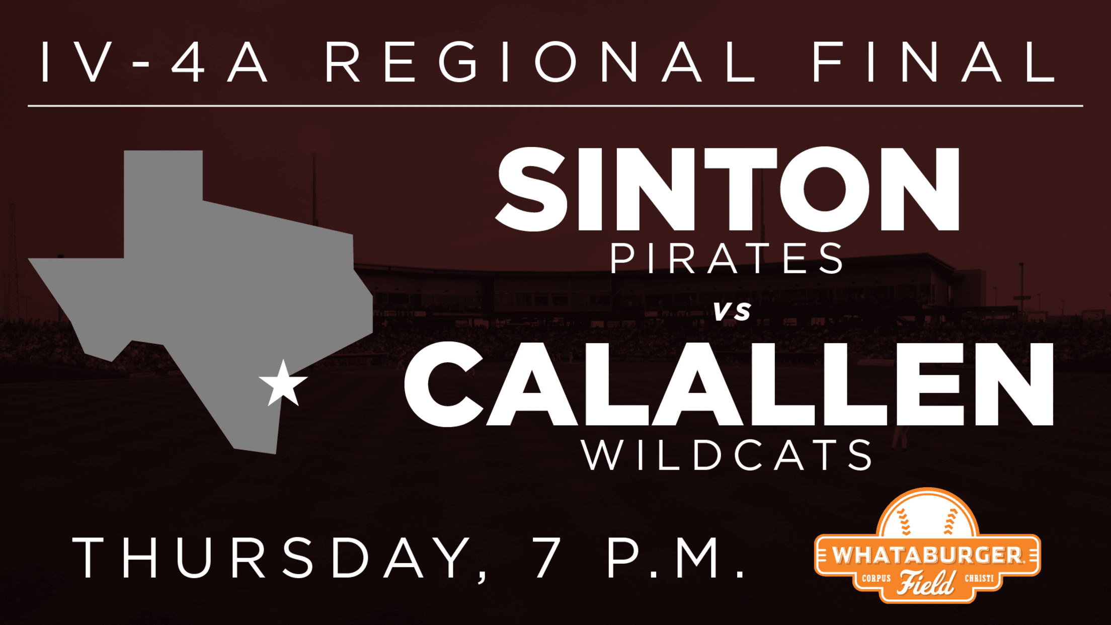 CORPUS CHRISTI – A one-game playoff between the No. 1 Calallen Wildcats and No. 2 Sinton Pirates will be played at Whataburger Field on Thursday, June 3 at 7 p.m., with the winning team advancing to the 4A State Baseball Tournament.