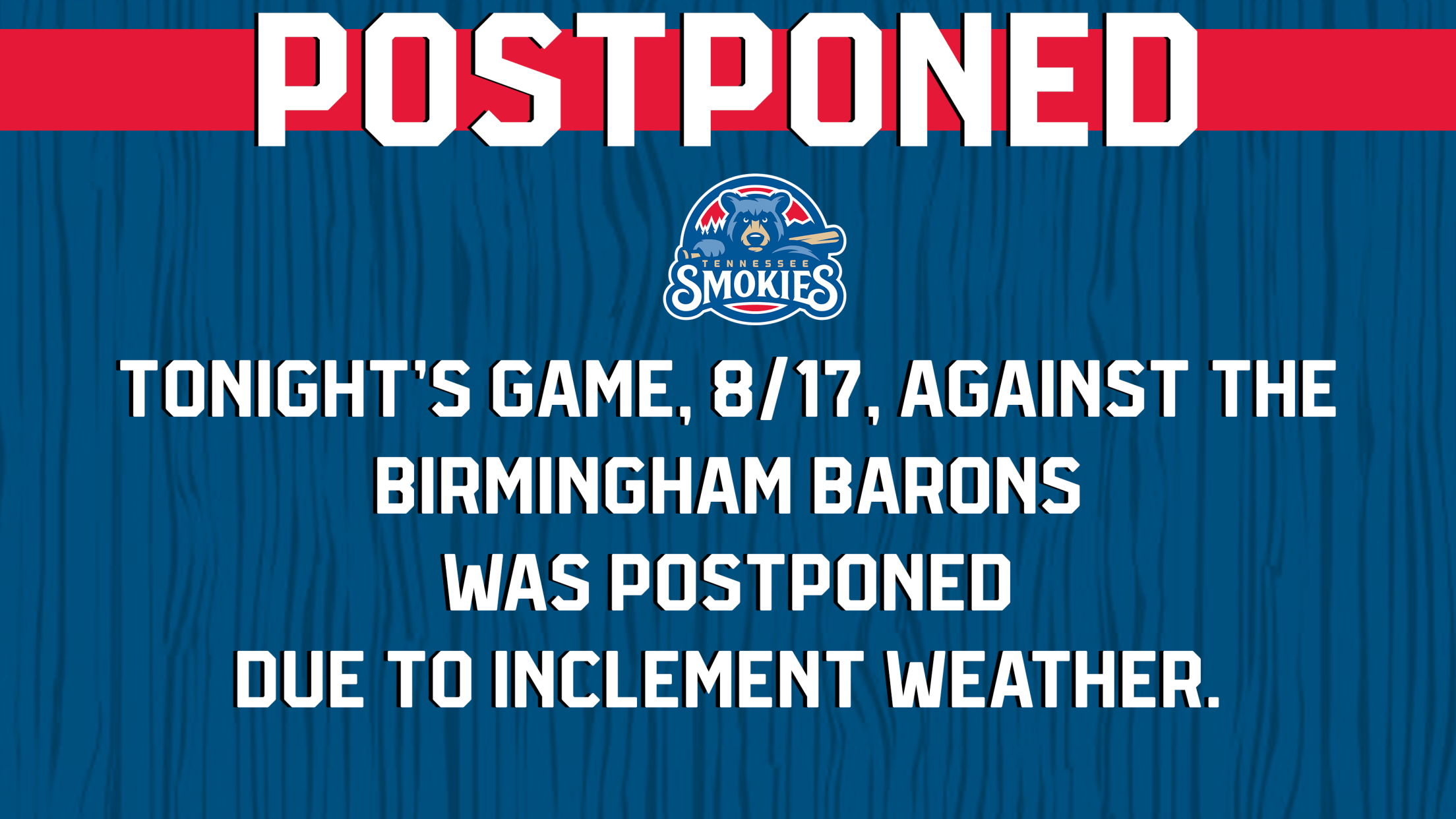 SEVIERVILLE, TN - Tuesday night’s game at Smokies Stadium between the Tennessee Smokies and Birmingham Barons has been postponed due to inclement weather. The make up date for Tuesday’s game has not yet been announced. Tickets to tonight’s game can be redeemed for any 2021 Smokies home game.