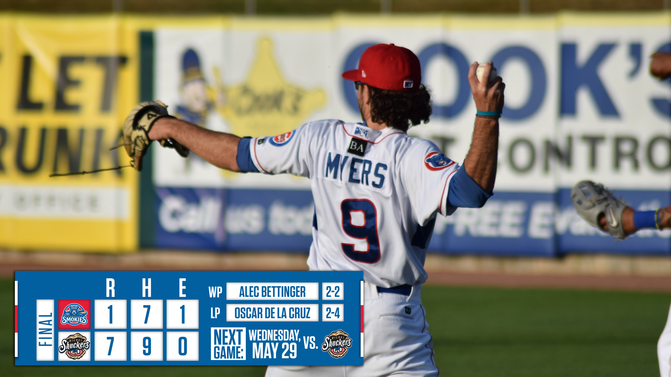 BILOXI, MS - The Biloxi Shuckers (29-22) opened up the five game series with a 7-1 win over the Tennessee Smokies (25- 25) Tuesday night at MGM Park. Six of the seven Shuckers' runs scored with two outs.After RHP Oscar De La Cruz (L, 2-2) recorded the first out of