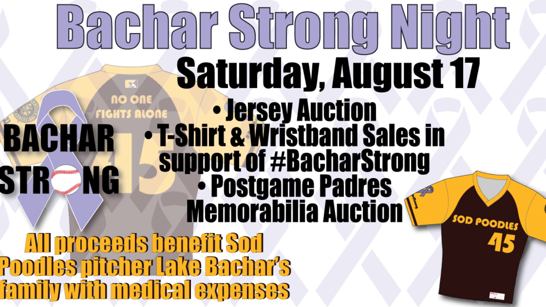 On Bachar Strong Night, the Sod Poodles will be wearing specialty, Padres throwback color-themed Sod Poodles jerseys with the phrase "No One Fights Alone" on the back and "#BacharStrong" on the sleeve.