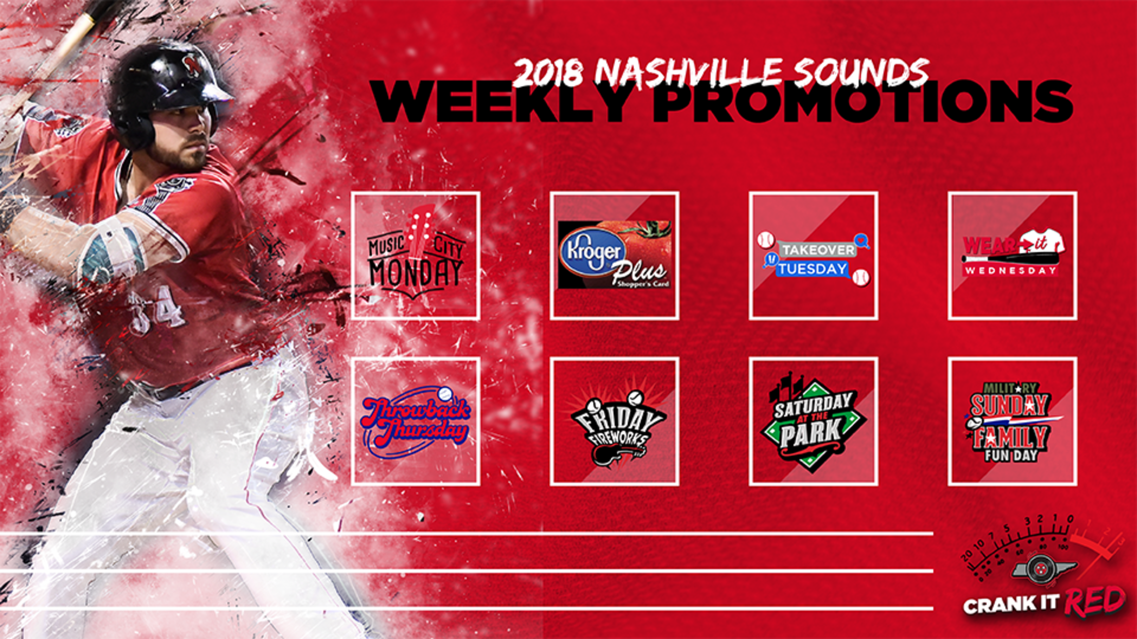The Nashville Sounds Baseball Club has announced its weekly promotions for the 2018 season. The 70-game home schedule at First Tennessee Park includes player-inspired t-shirt giveaways, fireworks shows, ticket discounts, food and drink discounts, social media guests, special jerseys, musical guests, military appreciation, and family days.
