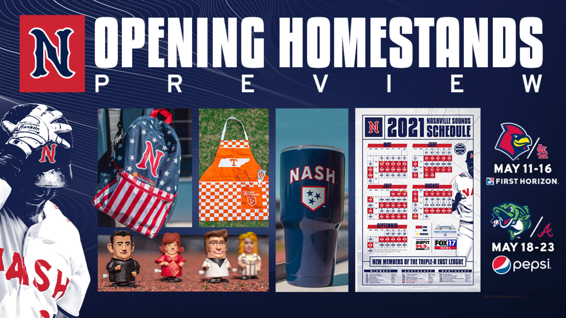 The second homestand of the season presented by Pepsi is from Tuesday, May 18 through Sunday, May 23. The Sounds welcome the Gwinnett Stripers, the Triple-A affiliate of the Atlanta Braves, to First Horizon Park for the first time in ballpark history.