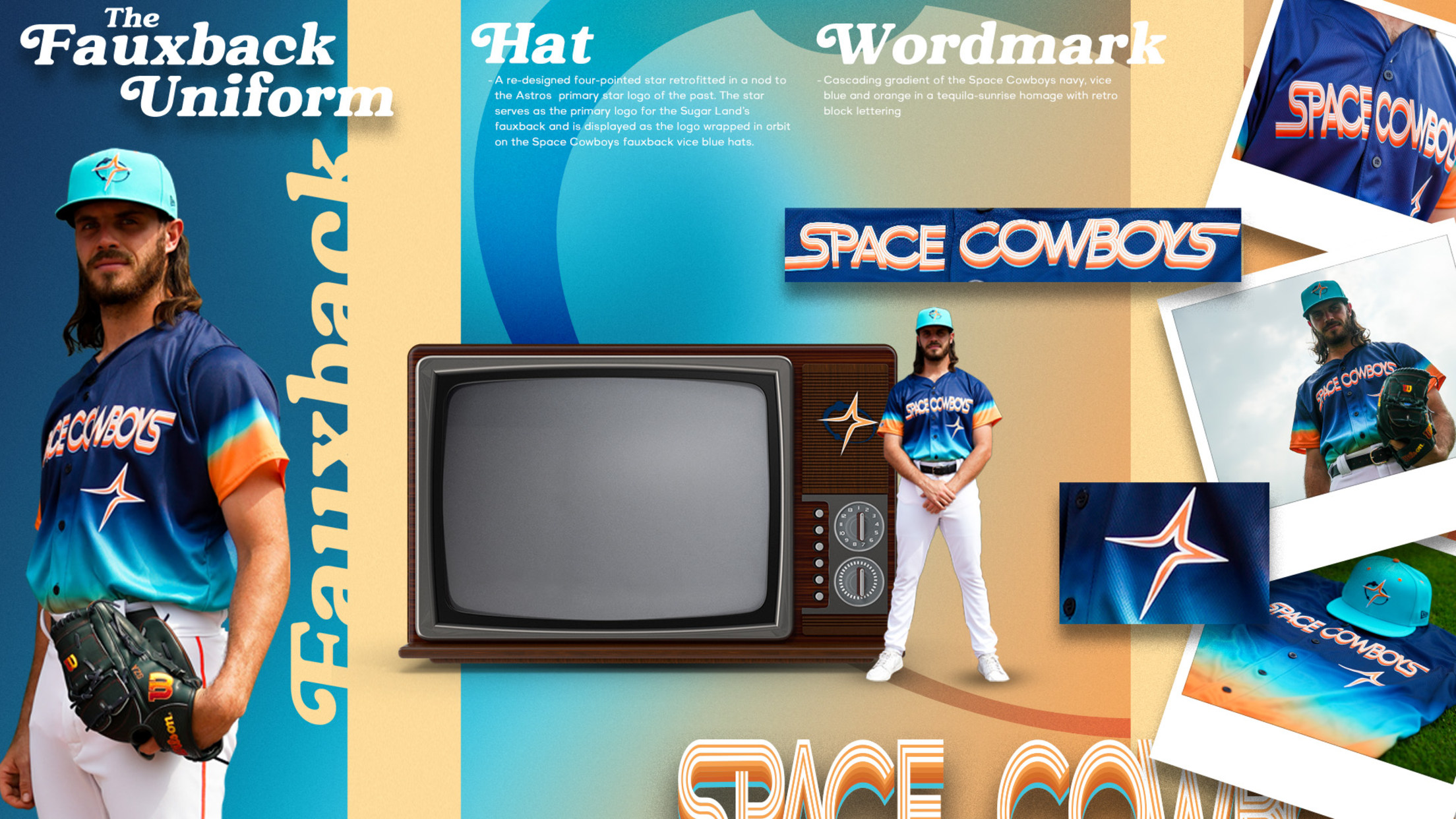 Sugar Land’s fauxback jerseys feature a cascading gradient of the Space Cowboys navy, vice blue and orange in a tequila-sunrise homage with retro block lettering ‘Space Cowboys’ across the front. A re-designed four-pointed star, normally glinting off the visor of the Space Cowboys primary logo, is retrofitted in a nod to the Astros primary star logo of the past. The star serves as the primary logo for the Sugar Land’s fauxback and is displayed as the logo wrapped in orbit on the Space Cowboys fauxback vice blue hats.