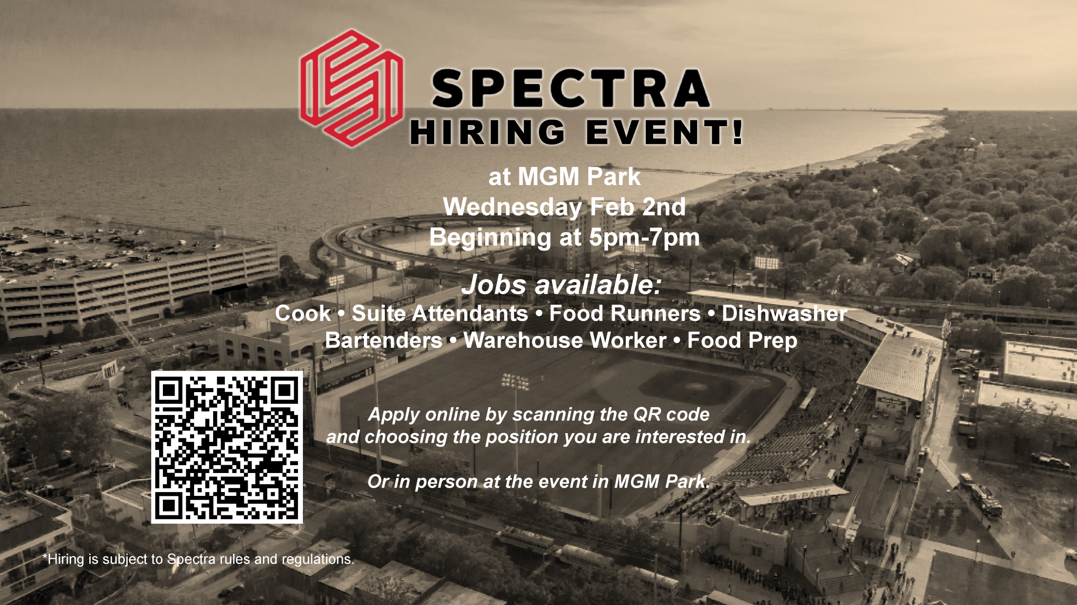 Spectra Food Services, the official concessionaire of MGM Park, will host a hiring event at MGM Park on Wednesday, February 2 from 5 to 7 pm.
