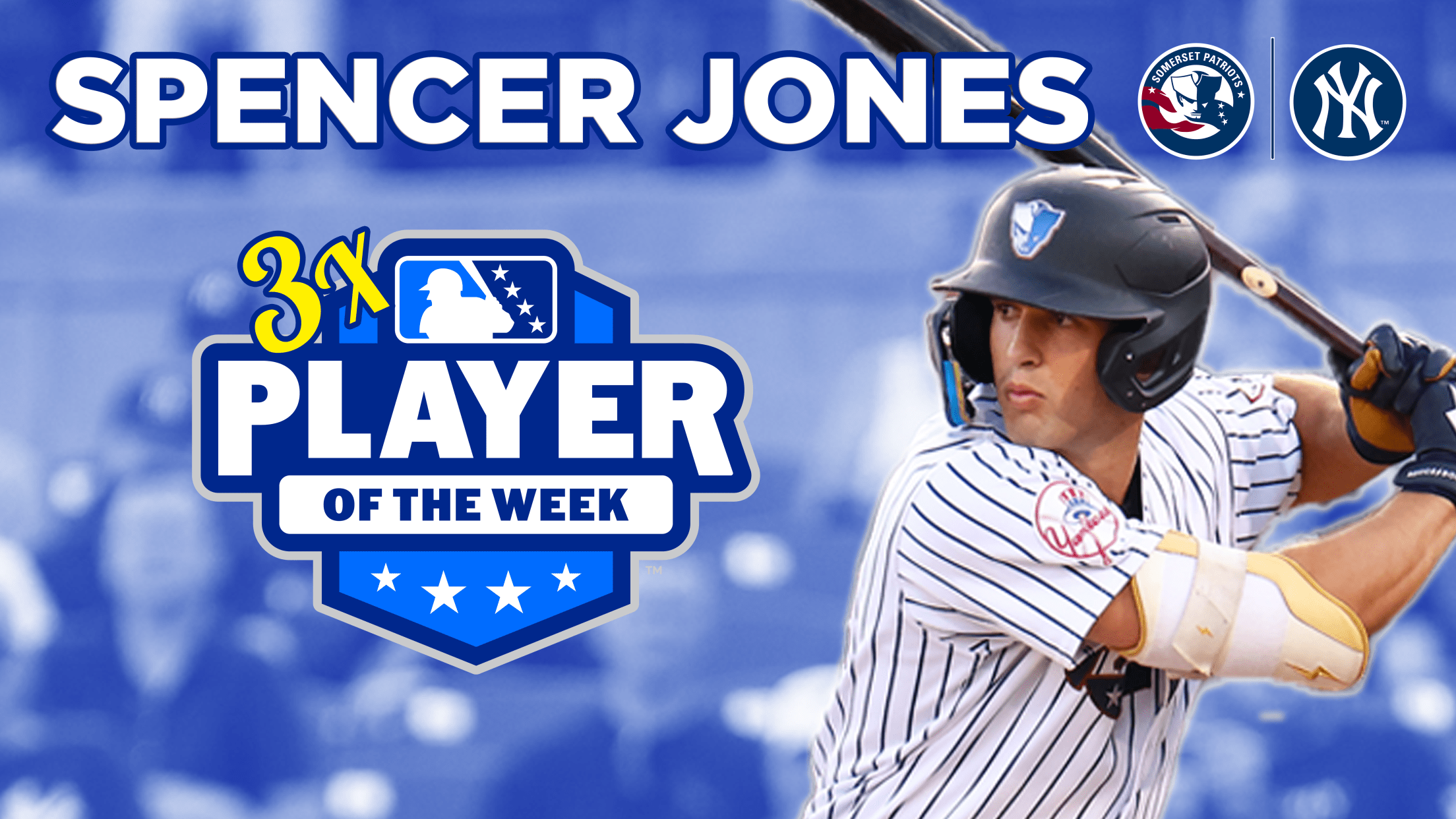 Bridgewater, New Jersey - Minor League Baseball has named Somerset Patriots OF Spencer Jones as the Eastern League Player of the Week for games played between 8/26 - 9/1. It is the third time this season Jones has been selected for the honor, all in the second half of the