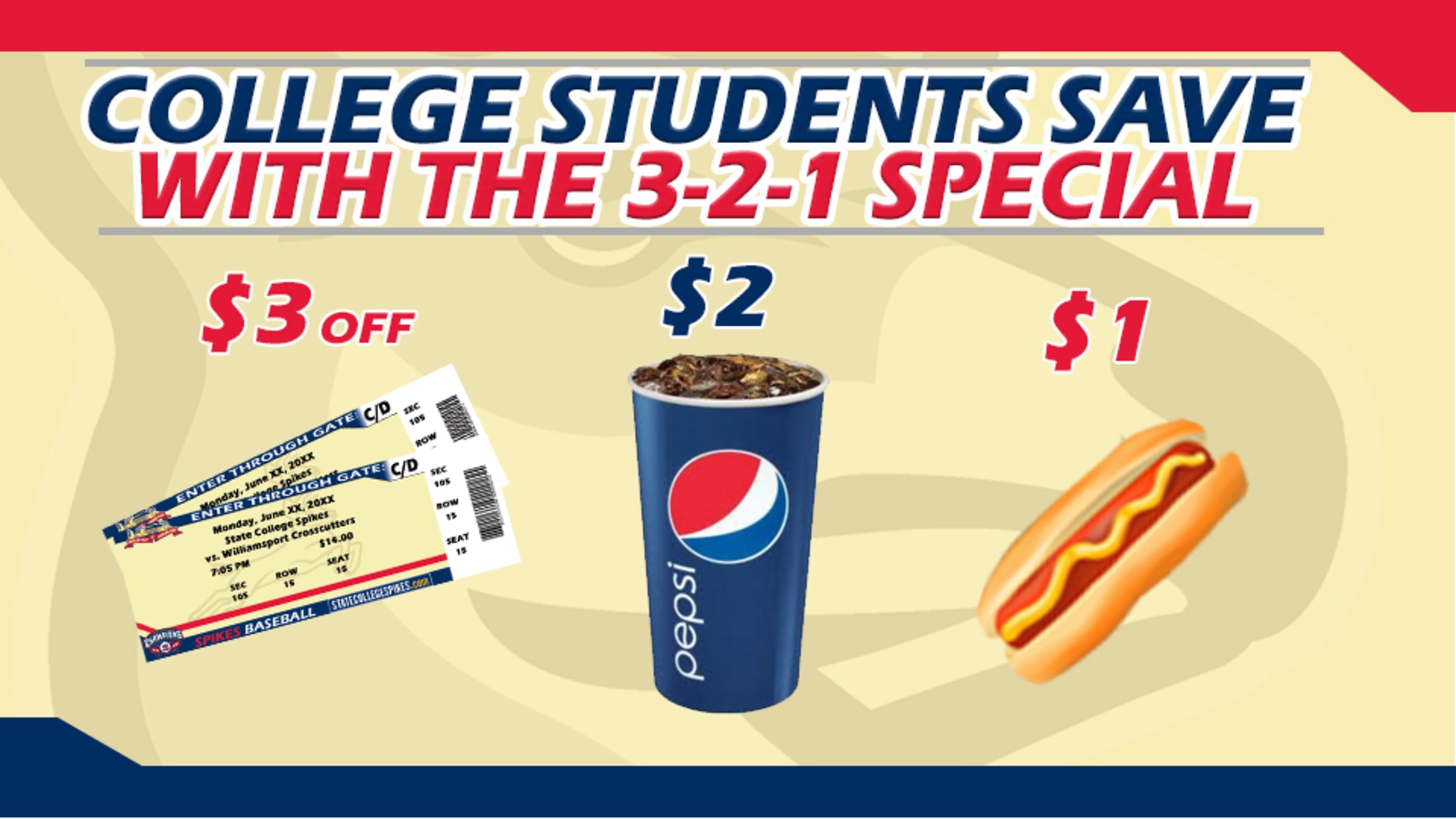 School is back in session for college students, and the State College Spikes have a great way for students to spend a fun, low-cost night out! The Spikes are offering area college students an incredible value at every remaining 2017 home game with the College 3-2-1 Special! College students with a valid ID will receive $3 off tickets, $2 sodas and $1 hot dogs during each Spikes home game.