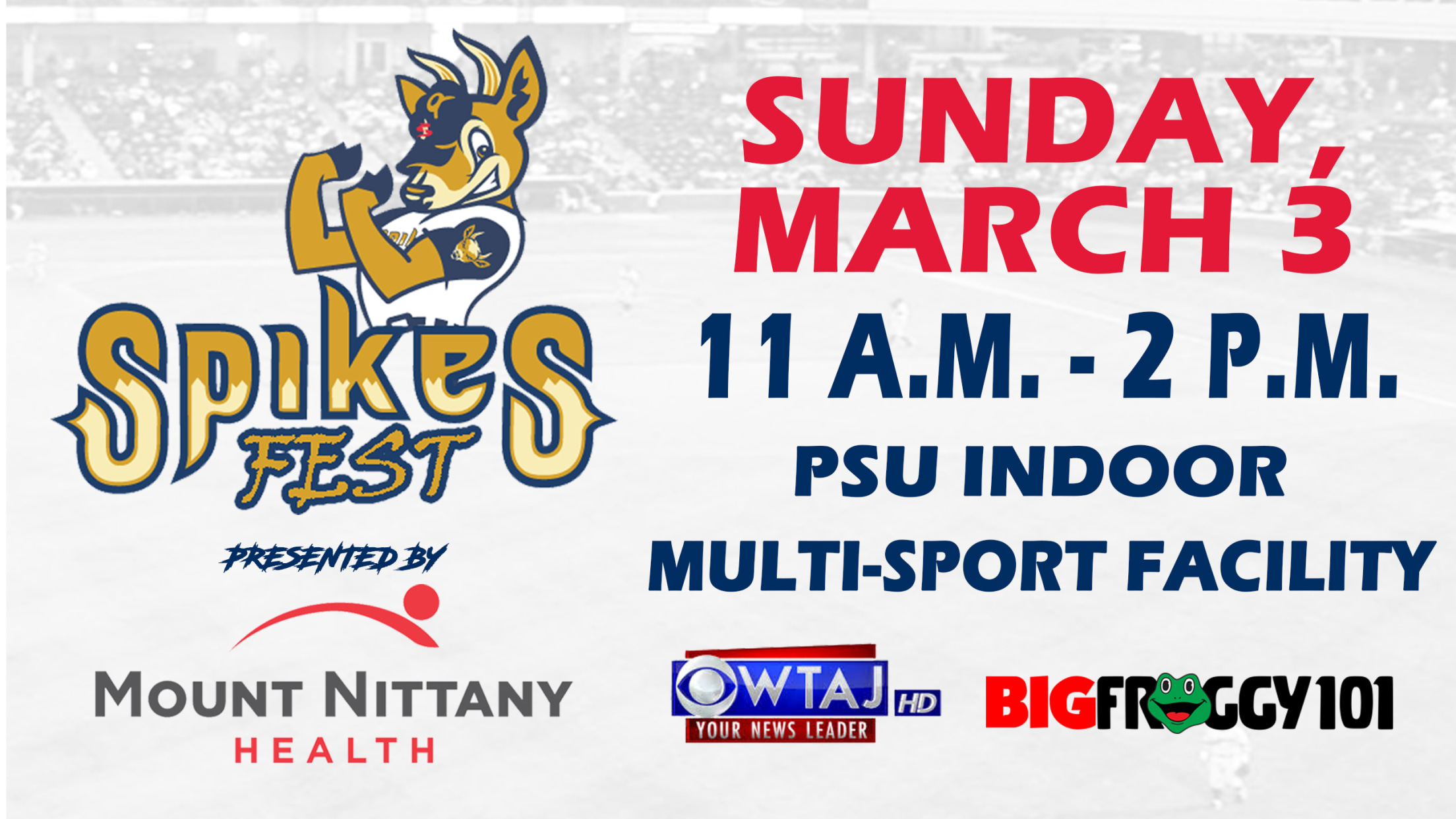 "We are excited to once again partner with a great organization in Mount Nittany Health to provide families with a fun, free way to beat the wintertime blues at SpikesFest," said Spikes General Manager Scott Walker. "We look forward to seeing everyone get ready for Spikes season inside the Penn State Indoor Multi-Sport Facility."