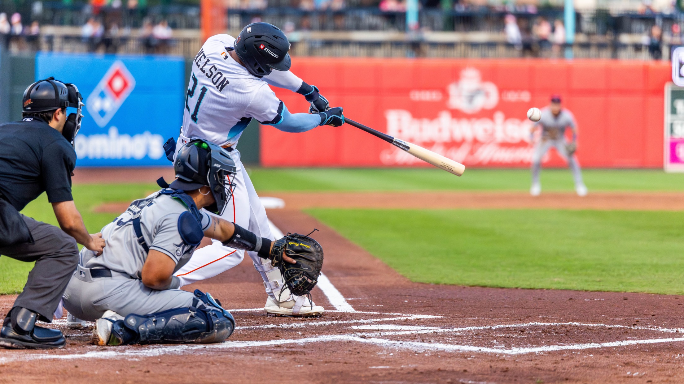 Sugar Land struck first with immediate impact, as James Nelson led off the game with a home run to deep center field, carrying over his hot bat from Friday night.