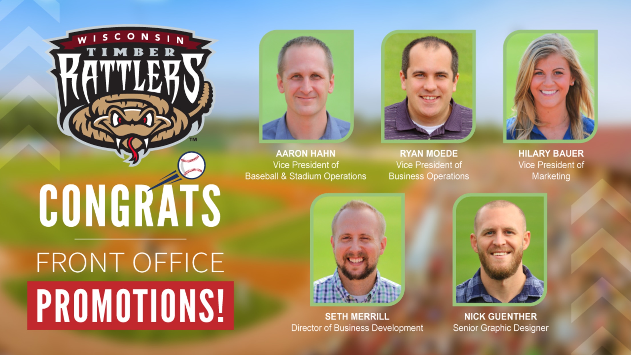 GRAND CHUTE, WI – The Wisconsin Timber Rattlers are happy to announce the promotion of five members of their front office. Aaron Hahn, Ryan Moede, Hilary Bauer, Seth Merrill, and Nick Guenther are heading into the 2022 season with new titles and new responsibilities.