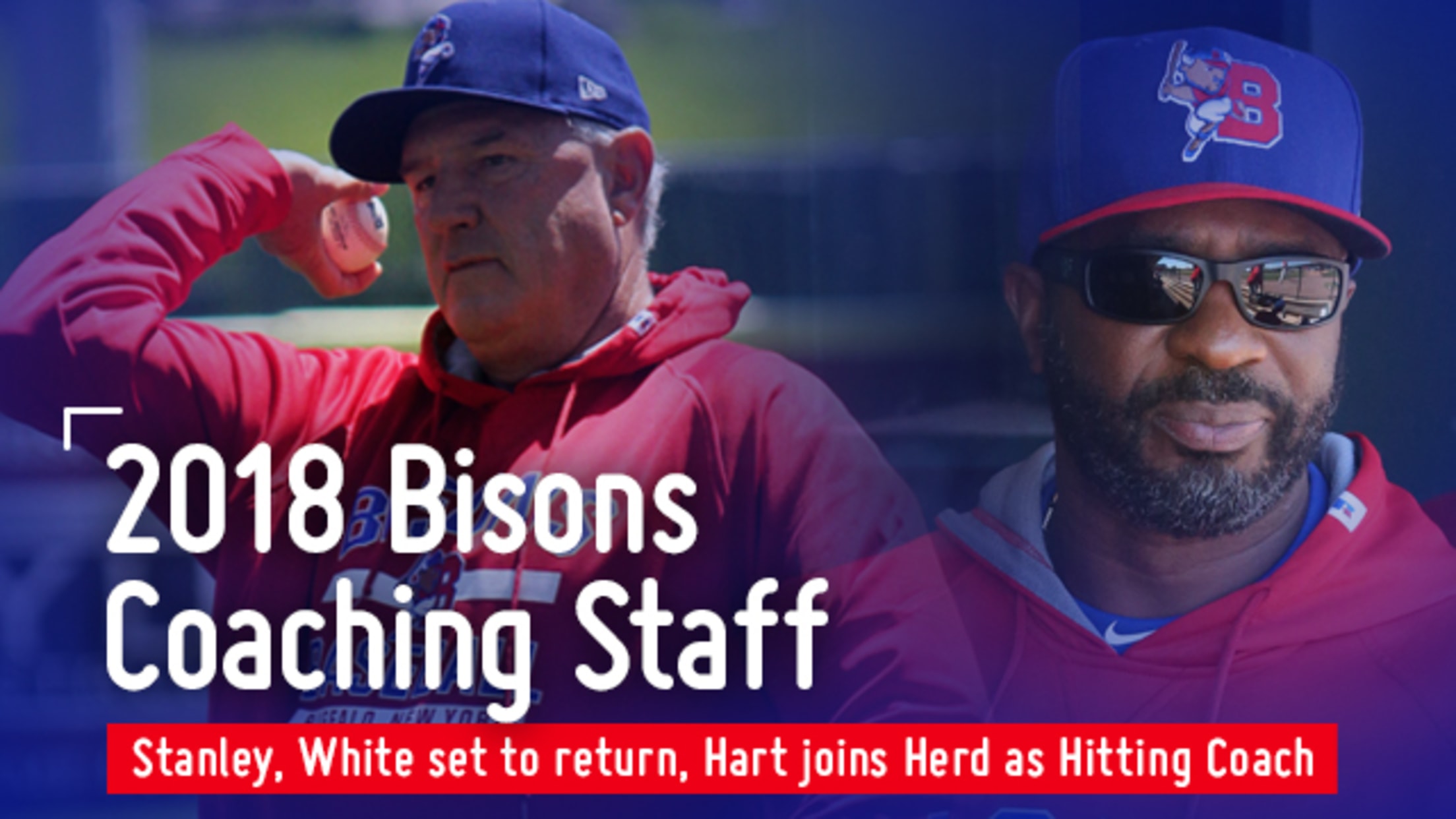 The Toronto Blue Jays today announced that both BOB STANLEY and DEVON WHITE will return as Bisons coaches for the 2018 season. Stanley will remain as the Herd's pitching coach while White takes over as the club's position coach under returning manager Bobby Meacham. The Blue Jays have also appointed COREY HART as the Bisons' new hitting coach.