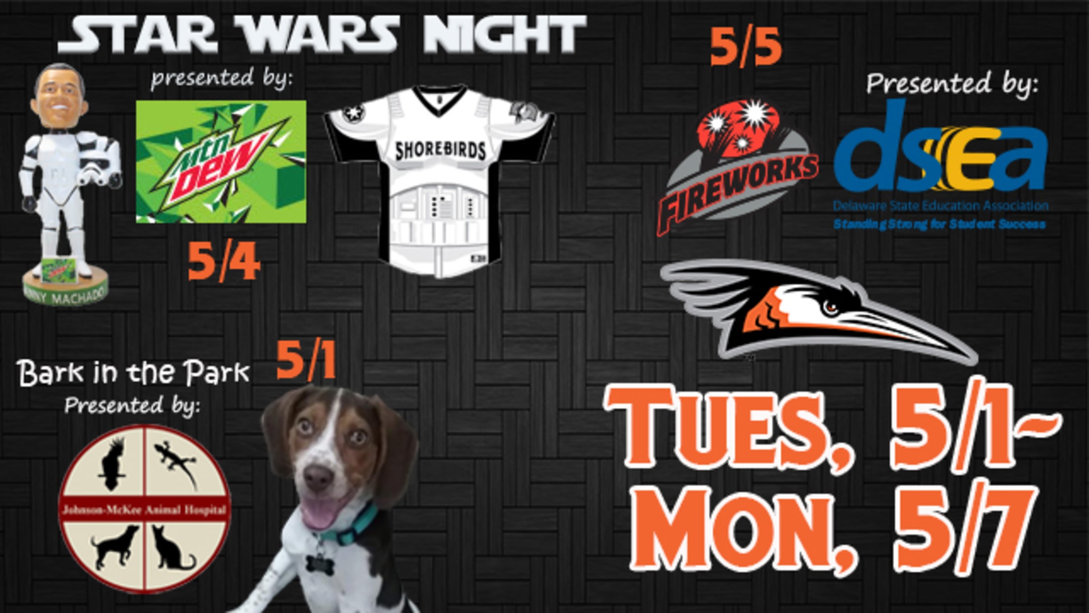 The homestand begins on Tuesday, May 1st with the second Bark in the Park Night, presented by Johnson-McKee Animal Hospital. This is a great opportunity to bring your dog out to Arthur W. Perdue Stadium to enjoy a Shorebirds game. Gates open at 6:00 PM with first pitch against the Greenville Drive scheduled for 7:05 PM.