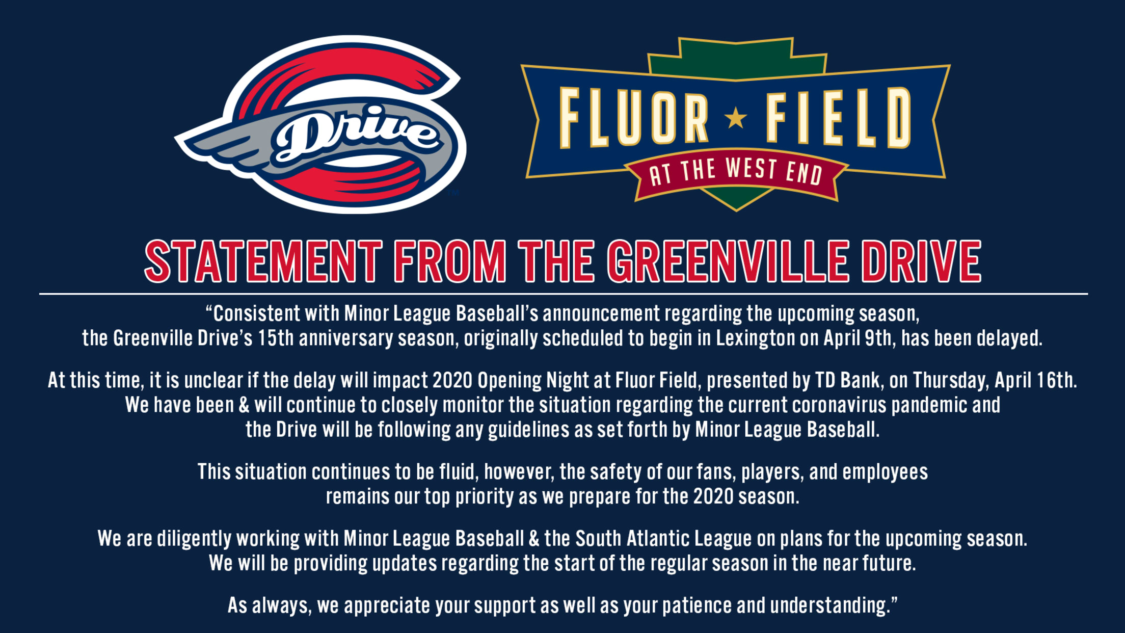 “Consistent with Minor League Baseball’s announcement regarding the upcoming season, the Greenville Drive’s 15th anniversary season, originally scheduled to begin in Lexington on April 9th, has been delayed. At this time, it is unclear if the delay will impact 2020 Opening Night at Fluor Field, presented by TD Bank, on